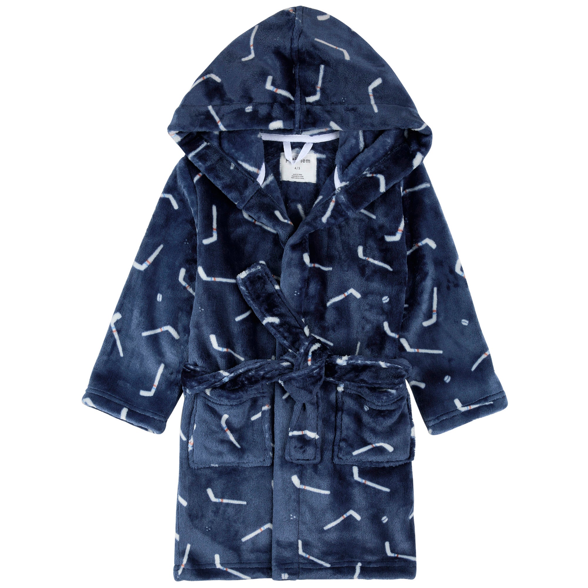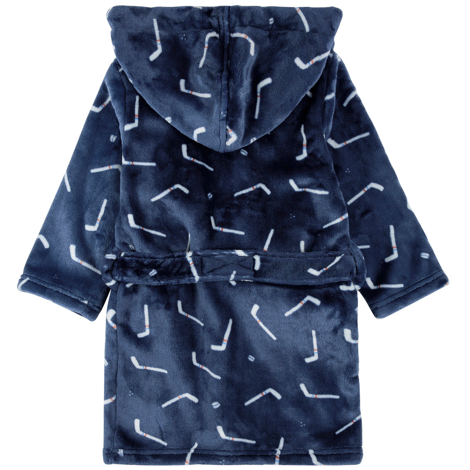 Wrap your little hockey fan in cozy comfort with the Hockey Sticks Plush Robe by Miles The Label. Made from ultra soft plush fabric, this hooded robe is designed to keep them warm from head to toe, whether it’s a chilly morning, post bath routine, or after a big game on the ice. The classic black base is covered with playful hockey stick motifs, giving it a sporty and fun touch. Featuring two front pockets for stashing small treasures and a classic tie closure for a secure fit, this robe blends function, comfort, and team spirit all in one. A must have for every young player or fan who loves the game.