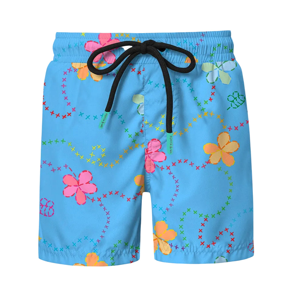 Bright, fun, and made for endless summer adventures, the Blue Jardin Swimshort by Piglo Kids brings playful charm to every beach and pool day. Designed in a vibrant blue hue with colorful stitched inspired waves and cheerful floral prints, these swim shorts stand out with their lively, garden inspired pattern. The elastic waistband with an adjustable drawstring ensures a secure and comfortable fit, while the lightweight, quick drying fabric keeps little ones feeling cool and ready for action. Complete with a practical back pocket for added detail, the Blue Jardin Swimshort is the perfect blend of style, comfort, and functionality for sunny days spent splashing and exploring.