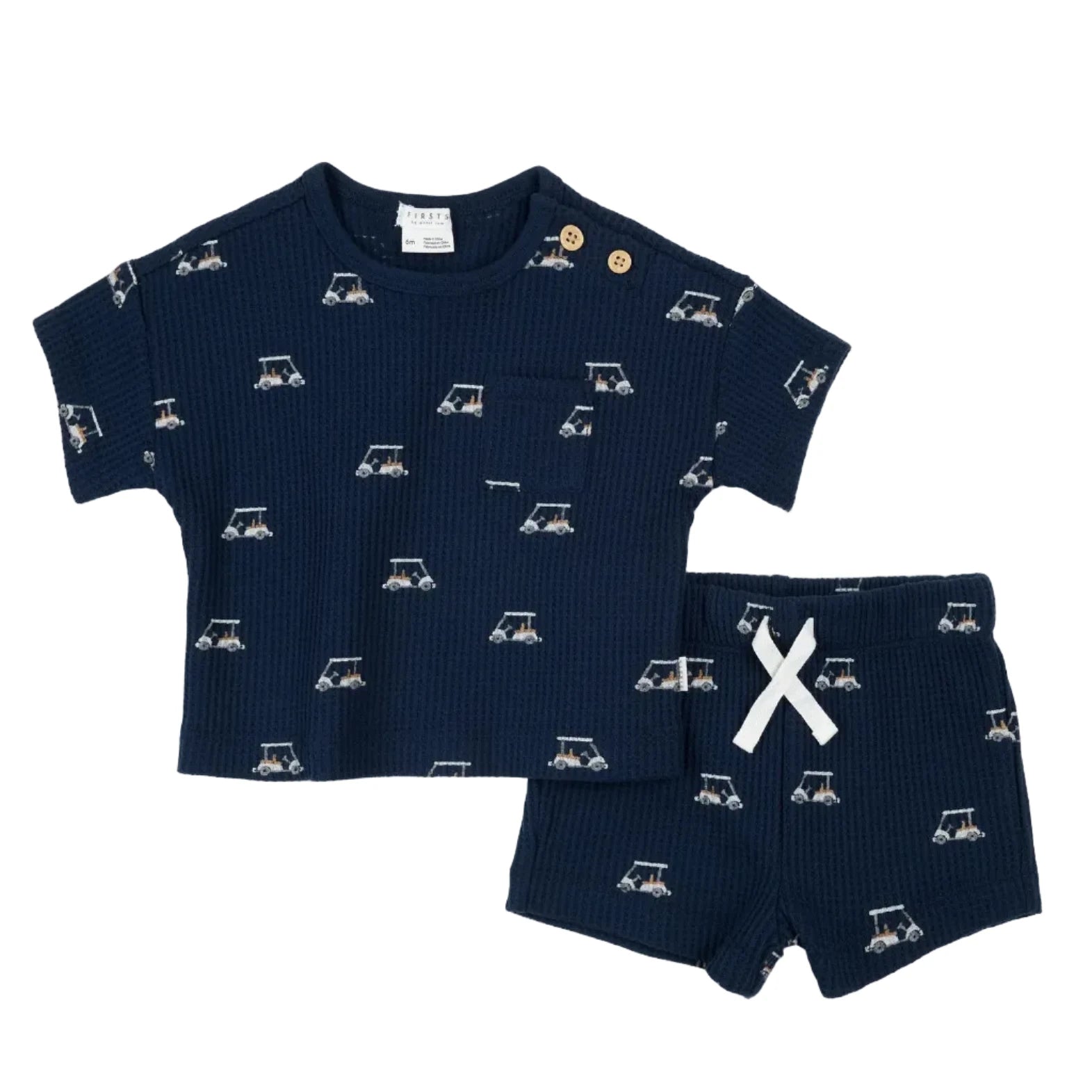Ready for sunny adventures, the Golf Cart Short Set by Petit Lem keeps little explorers cool, comfy, and stylish. This 2 piece set includes a short sleeved tee with a handy double button placket and a single chest pocket, paired with matching shorts featuring a gently elasticated waistband for easy movement. Made from breathable organically grown cotton thermal with a touch of recycled polyester and elastane, both pieces showcase the playful Small Golf Carts print, perfect for trips to the club, backyard adventures, or everyday explorations. Durable, soft, and easy to wear, itās a go-to outfit for warm weather fun.