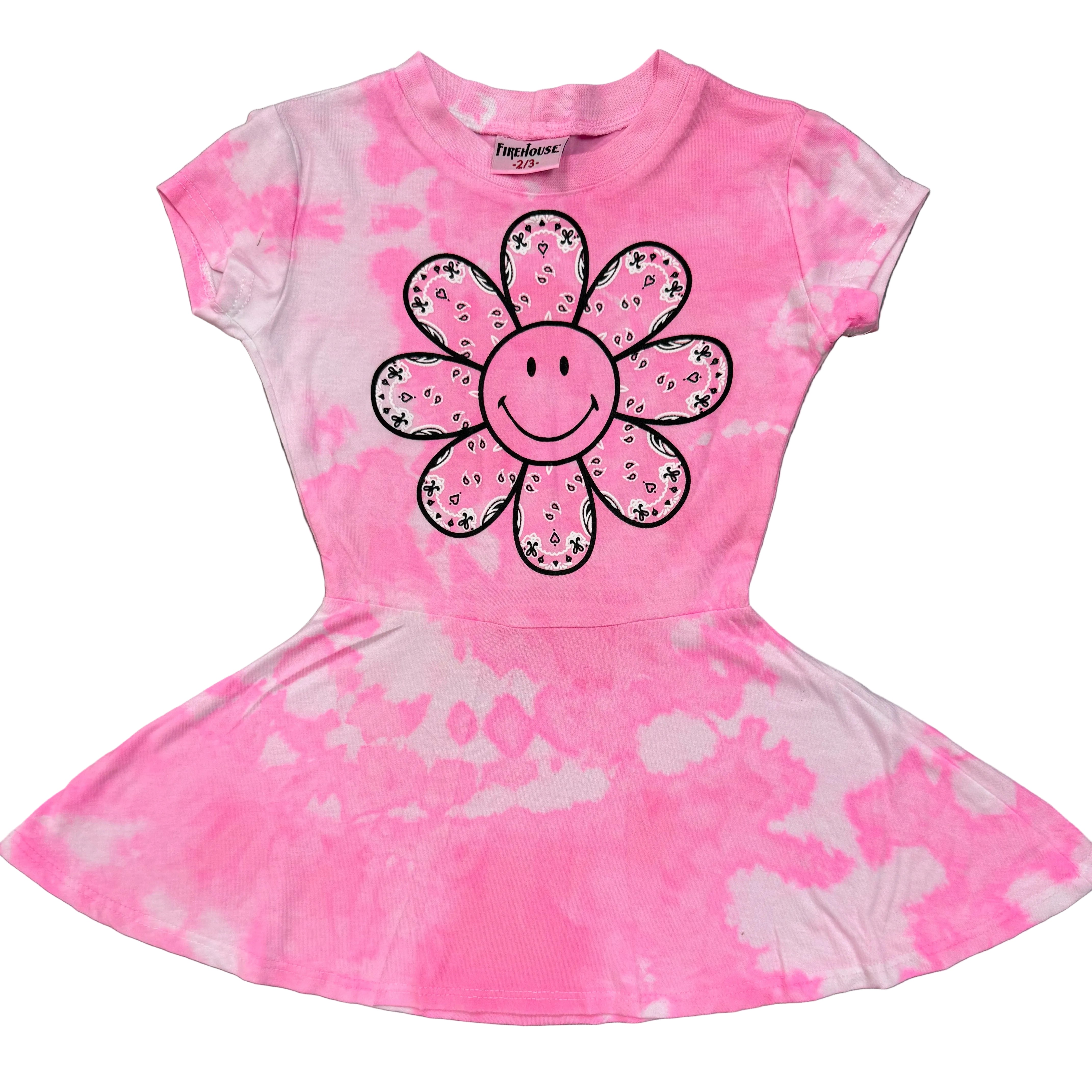 The Bandana Flower Short Sleeve Dress by Firehouse is a fun loving blend of color and carefree style. Designed in a pink tie dye wash with a bandana inspired flower motif, this cheerful dress is finished with a smiley face sun for an extra pop of happy charm. The soft t shirt style top and easy A-line silhouette make it comfortable enough for all day adventures, from playground fun to weekend outings. Bright, playful, and full of personality, it’s the perfect pick for girls who love a little sunshine in their style.
