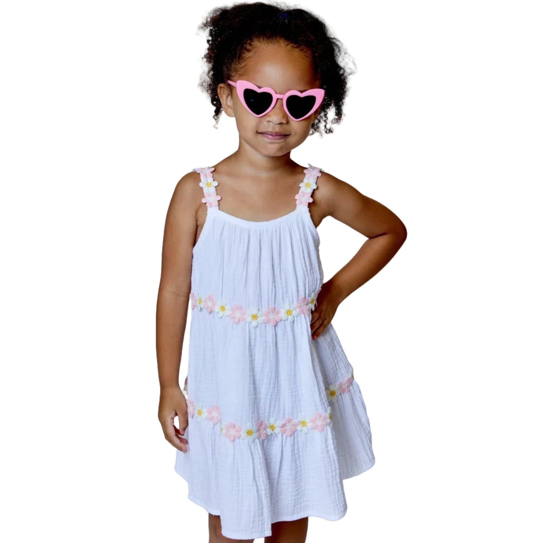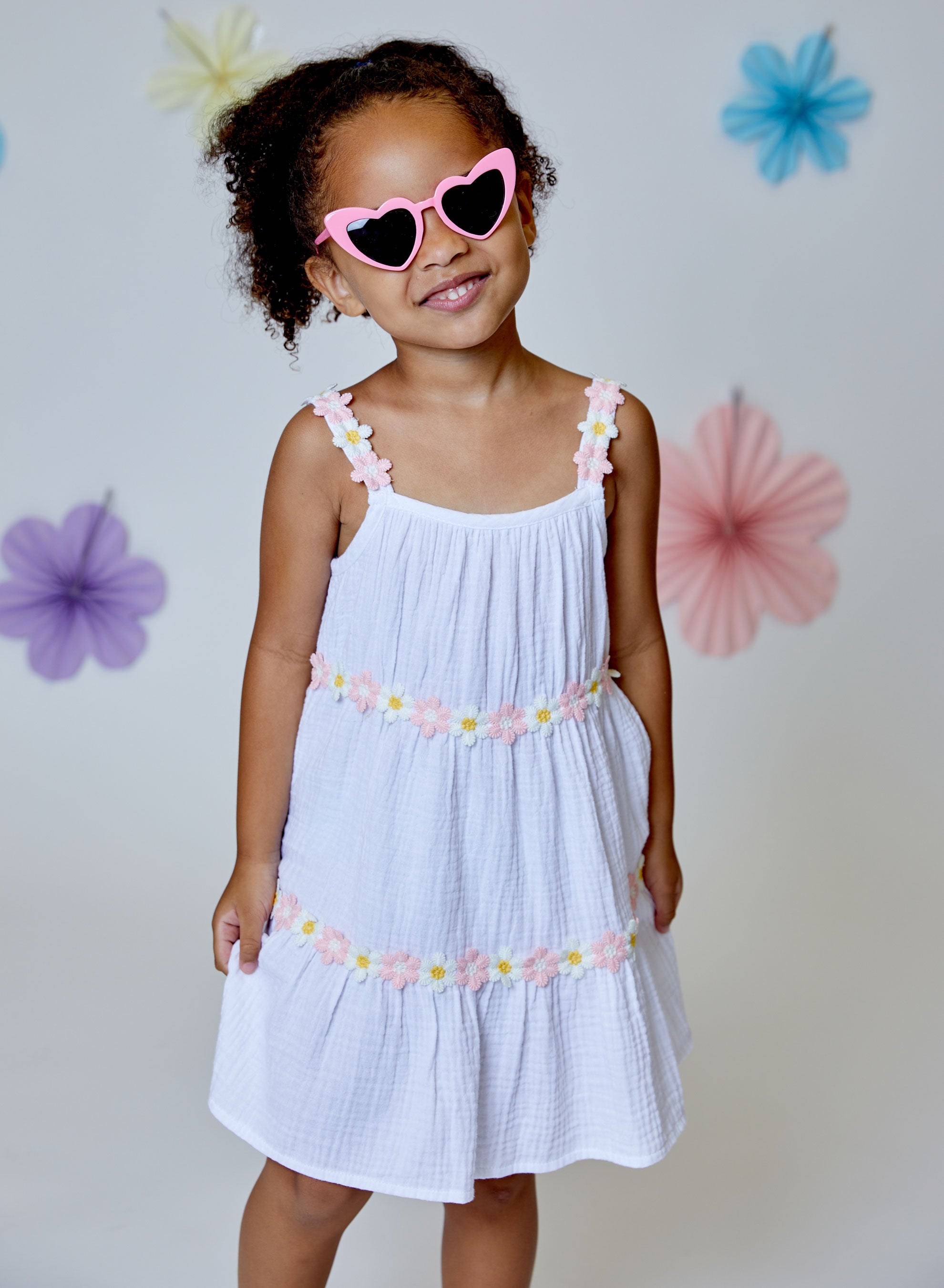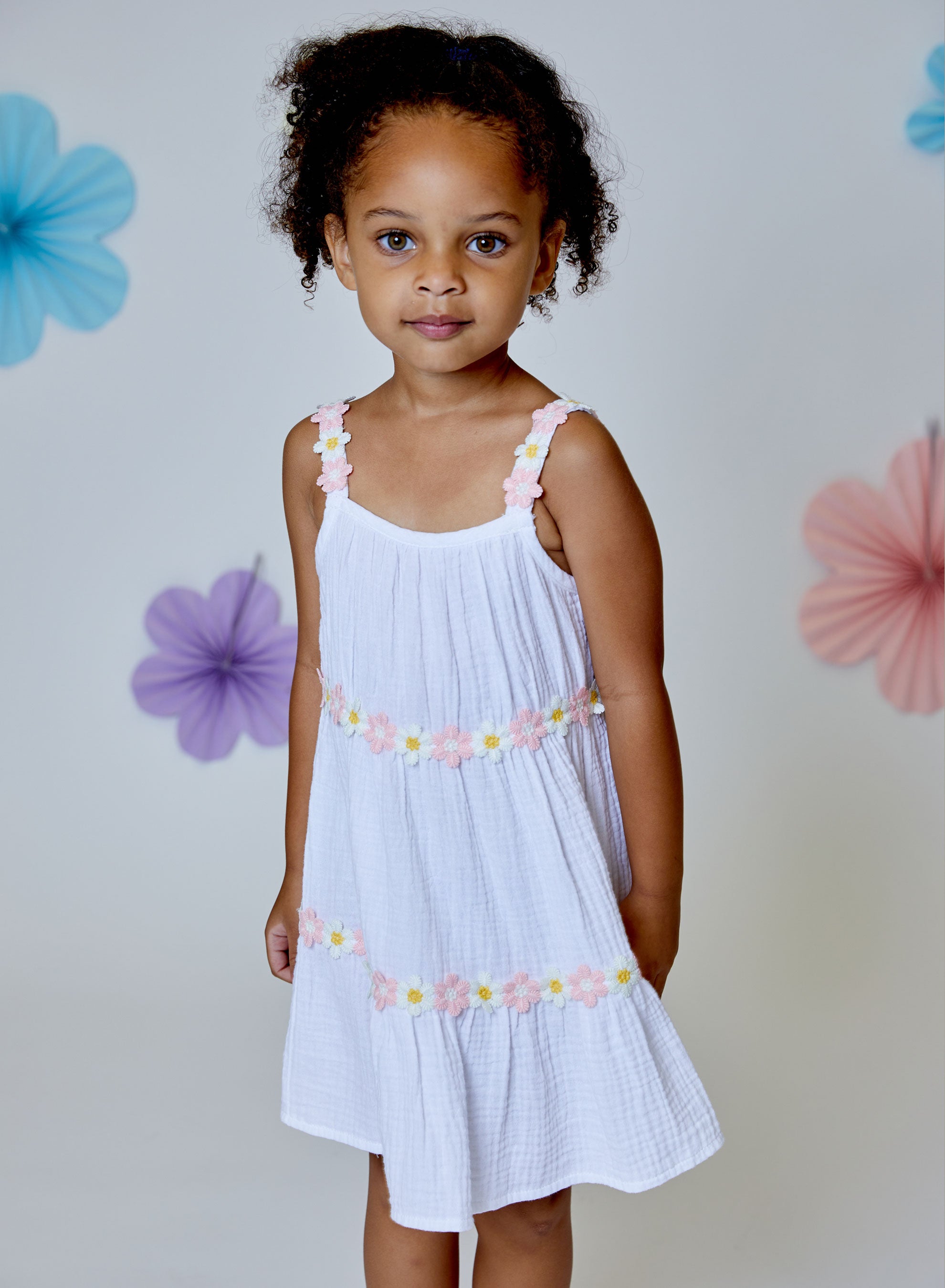 The Daisy Gauze Dress by Design History is a light, airy piece designed for effortless comfort and soft, feminine style. Made from breathable white gauze fabric with a relaxed, loose fit, it drapes beautifully for an easy, flowy silhouette. Two delicate tiers of light pink daisies circle the dress, adding a subtle floral charm, while thin shoulder straps with matching light pink daisies complete the look with a playful touch. The white and light pink color keeps the dress fresh and perfect for warm, sunny days at school, beach or the playground!