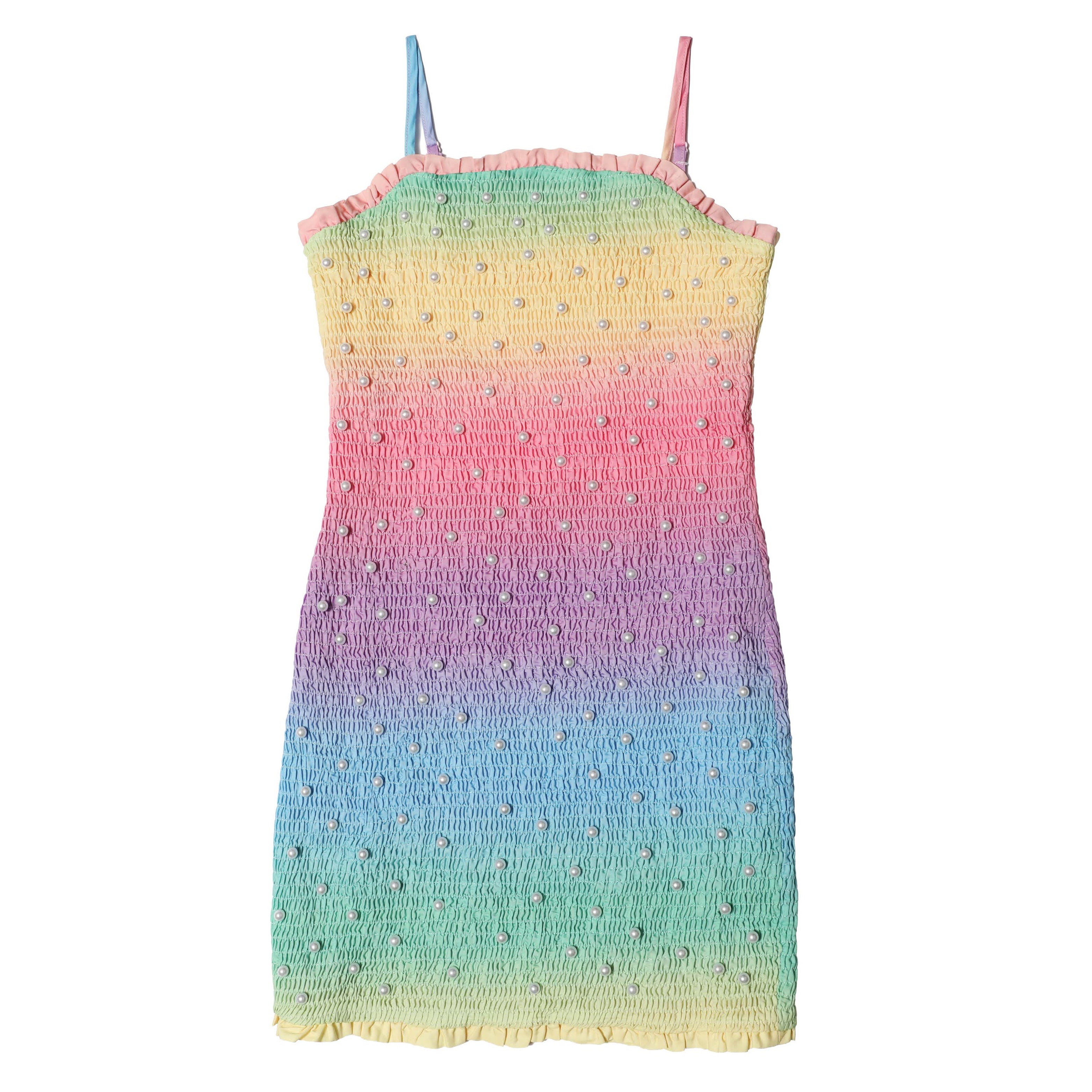 The Rainbow Smocked Dress is a charming and comfortable choice for stylish girls, featuring smocking throughout for a stretchy, flattering fit. Thin adjustable straps, a subtle ruffle hem, and scattered pearl details add a touch of elegance. Soft and lightweight, this dress is perfect for special events, parties, or everyday wear where style meets all day comfort.