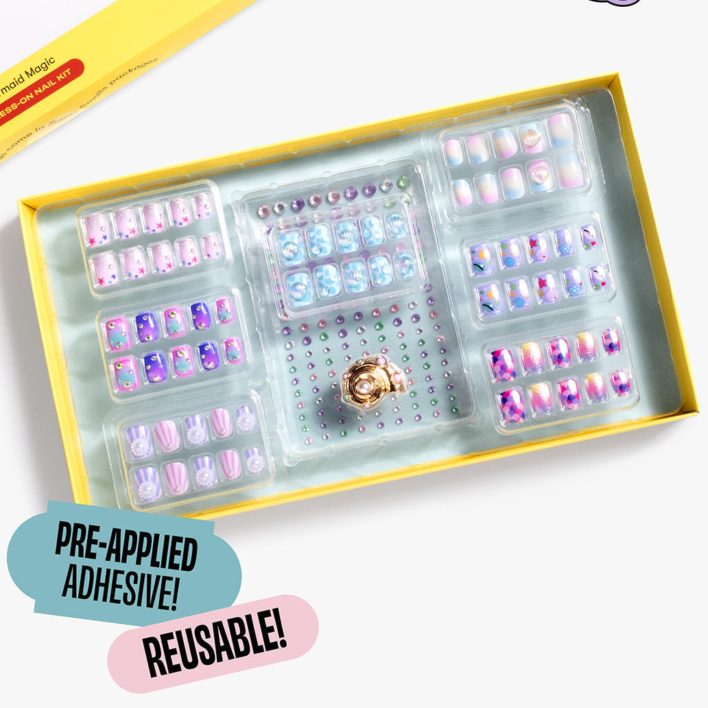 Dive into under-the-sea glam with the Mermaid Press On Nail Kit by Super Smalls. Designed to bring ocean sparkle to little fingertips, this magical set includes seven sets of reusable press on nails featuring mermaid inspired designs. Add extra shine with pink, purple, green, and white gem nail stickers, and finish the look with the included adjustable shell shaped ring. The nails come with pre-applied adhesive, making them easy to apply with no glue and no mess. Perfect for playdates, parties, or imaginative dress up, this kit delivers sea worthy style with effortless fun. Small parts included; not intended for children under 3 years.