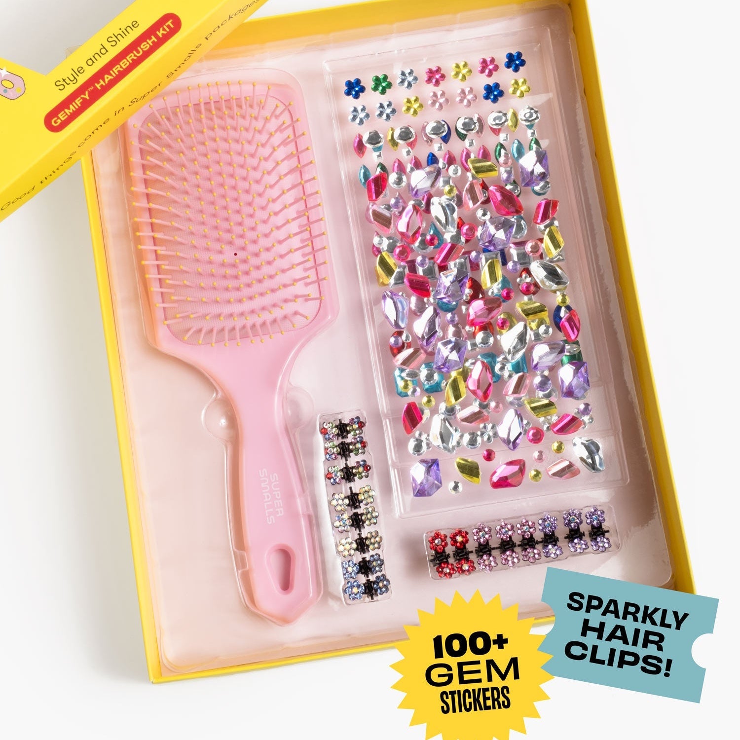 Brushing up on sparkle skills has never been so fun with the Style & Shine Gemify Hairbrush Kit by Super Smalls. This playful kit includes a soft pink hairbrush ready to decorate, three sheets of gem stickers for endless customization, and sparkly gem flower mini clips to complete the look.