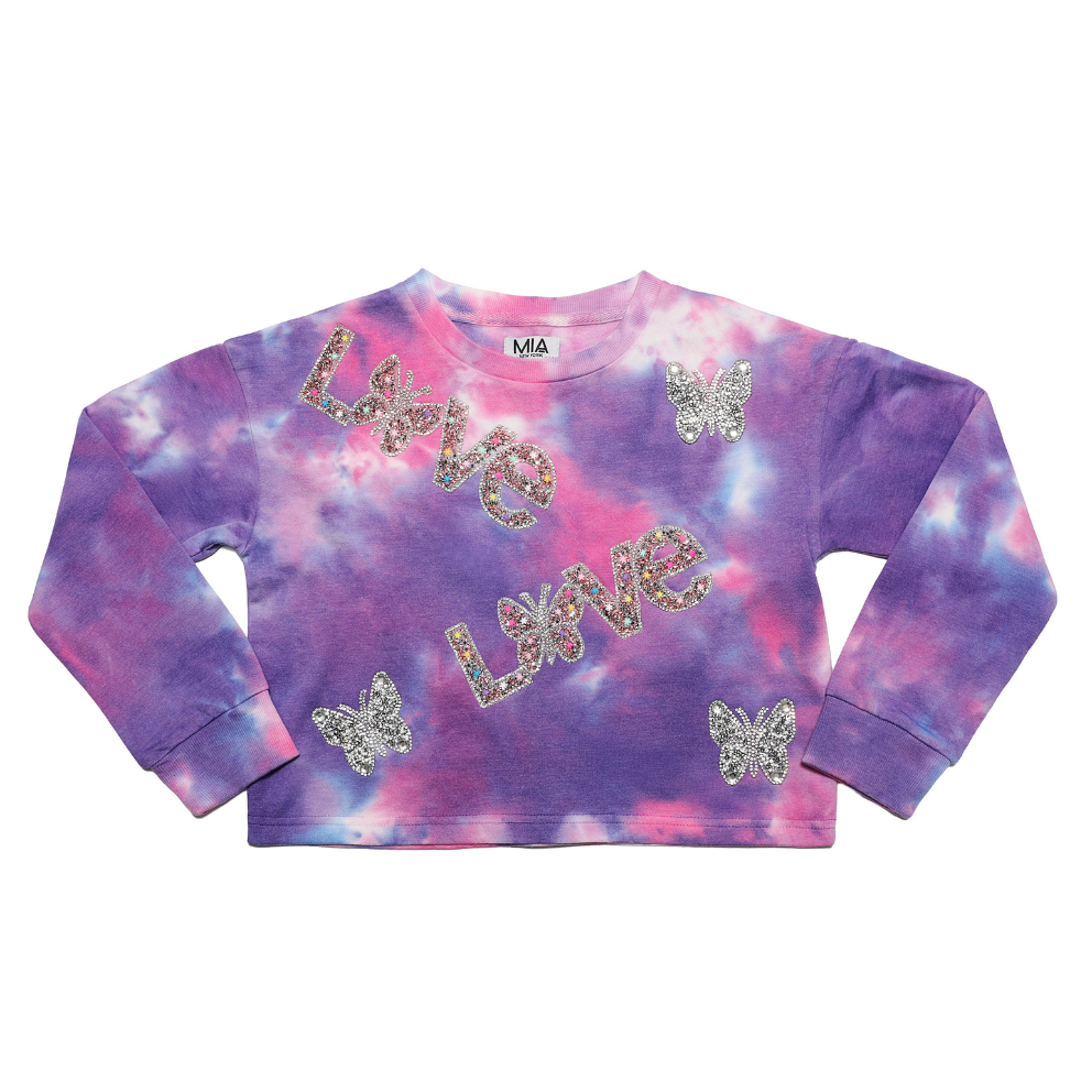 The Tie Dye Crystal Butterfly Sweatshirt by MIA adds a sweet, sparkly touch to everyday style with soft purple and pink tie dyes and shimmering crystal butterflies across the front. Finished with LOVE written boldly across the chest and cuffed wrists for a comfortable fit, this kidsā sweatshirt is perfect for cozy all day wear with a little extra shine.