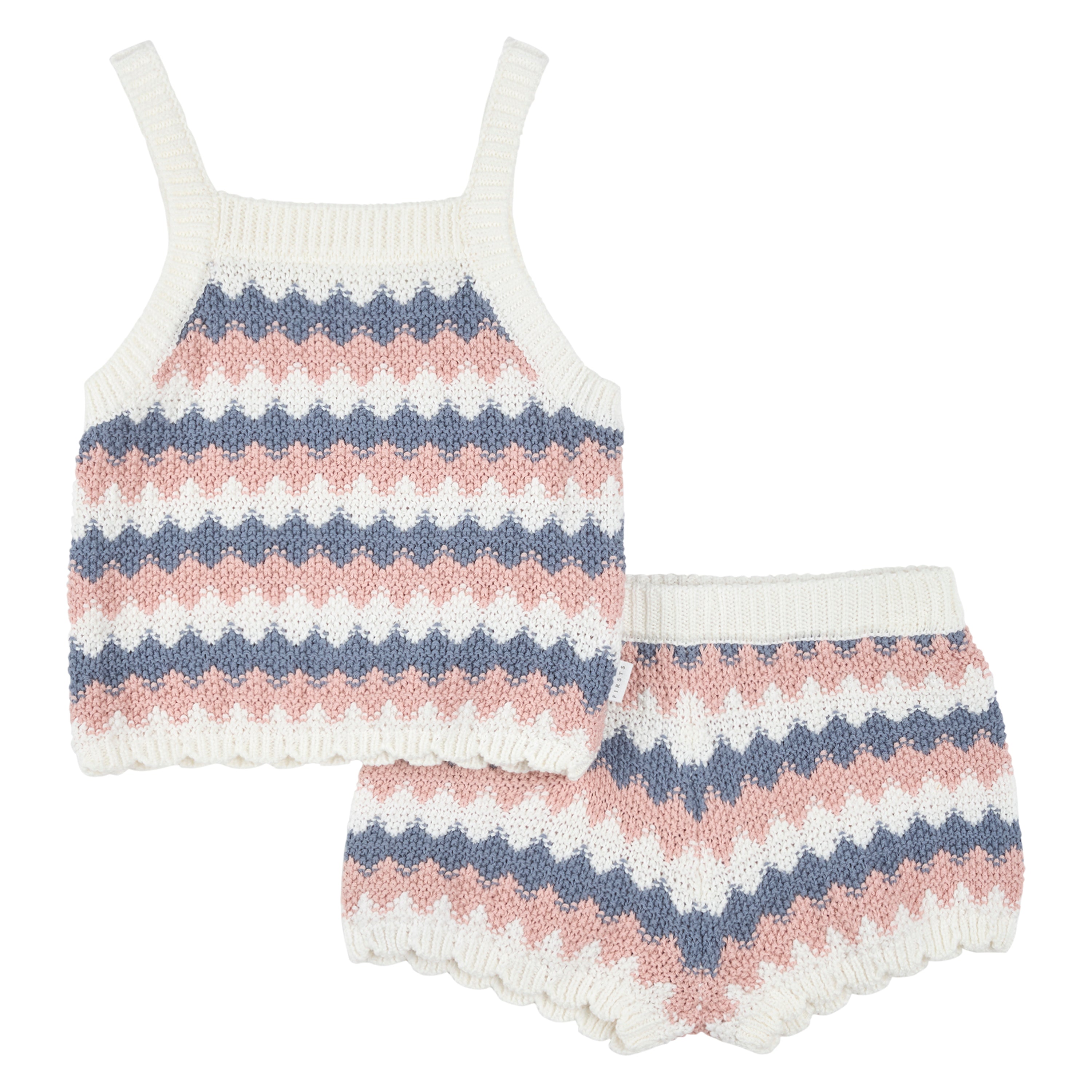 Soft, breathable, and effortlessly stylish, the Knit Short Set by Petit Lem in beige with subtle tone-on-tone stripes is perfect for warm-weather adventures. Made from 100% organically grown cotton sweater knit, this two piece set features a lightweight top and coordinating shorts designed for comfort and ease. Gentle scallop trims and ribbed hems add a delicate, polished touch, while the stretchy, breathable knit ensures all-day wearability for sunny days at the park, beach, or on vacation. Elegant yet playful, this set is a timeless addition to any summer wardrobe.