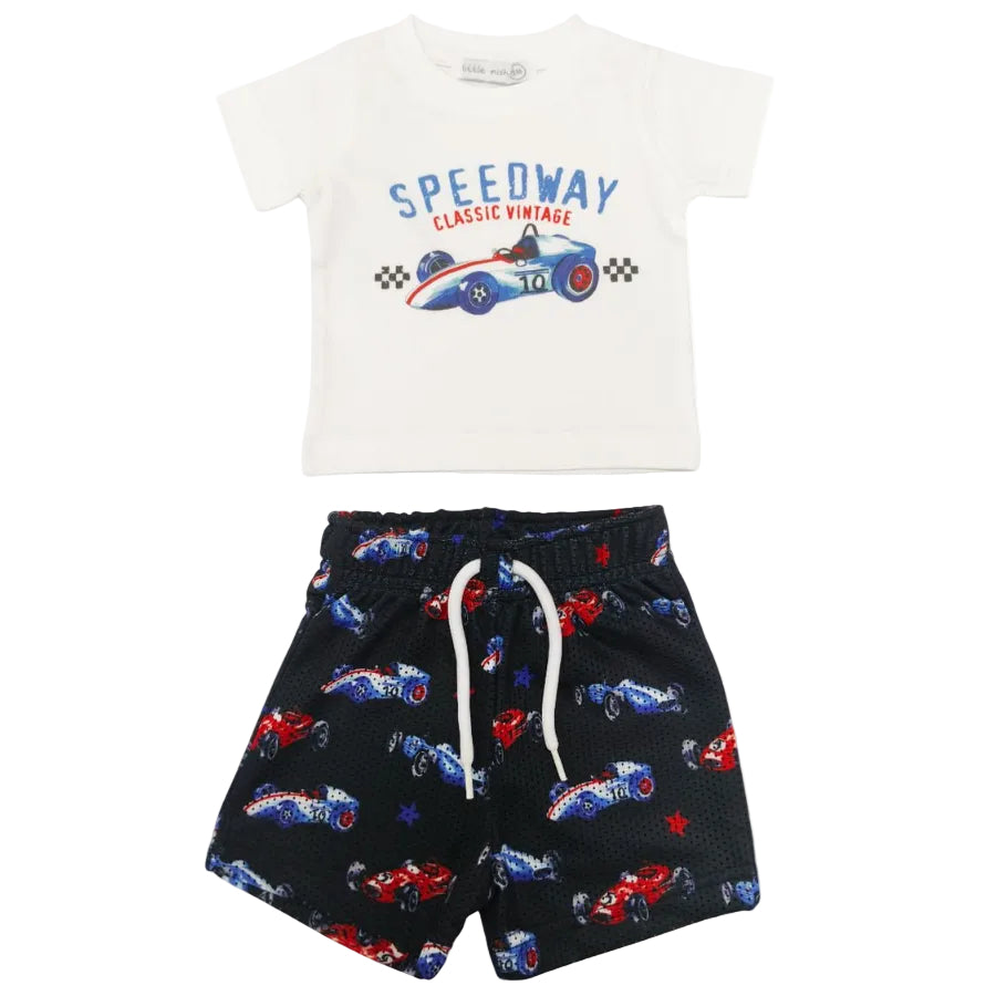 Get ready for fast paced fun with the Little Mish Speedway Mesh Shorts Set! This playful two piece set features a crisp white cotton t-shirt with a car motif front and center, paired with blue cotton shorts featuring an elastic waistband, faux drawstring, and all over car prints. Soft, breathable fabric keeps little ones comfortable during playtime, lounging, or casual outings, while the racing inspired design adds energy and excitement to any outfit. Perfect for kids who love cars, speed, and adventure!