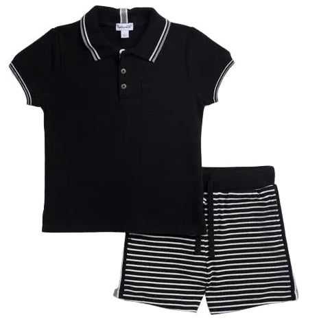 The Bennett Stripe Short Set by Splendid is the perfect combination of comfort and casual style for little ones. Featuring a short sleeve tee with three front buttons and thin line stripe accents along the collar and arm hems, paired with matching shorts that have an elastic waistband and drawstring detail, this set is designed for easy, everyday wear. The black base color is complemented by subtle horizontal stripes, and the super-soft fabric ensures all day comfort, making it ideal for playdates, lounging at home, or casual outings.