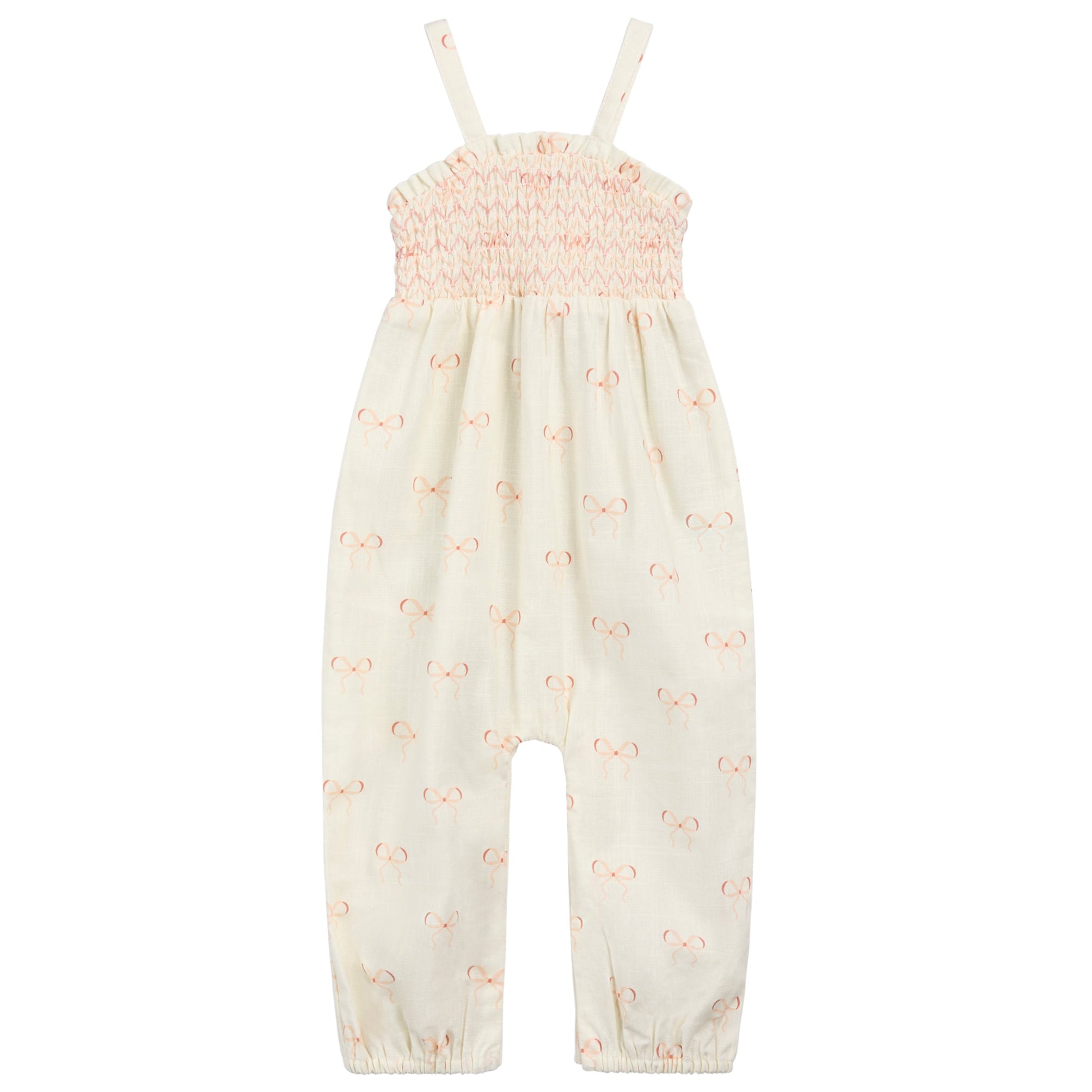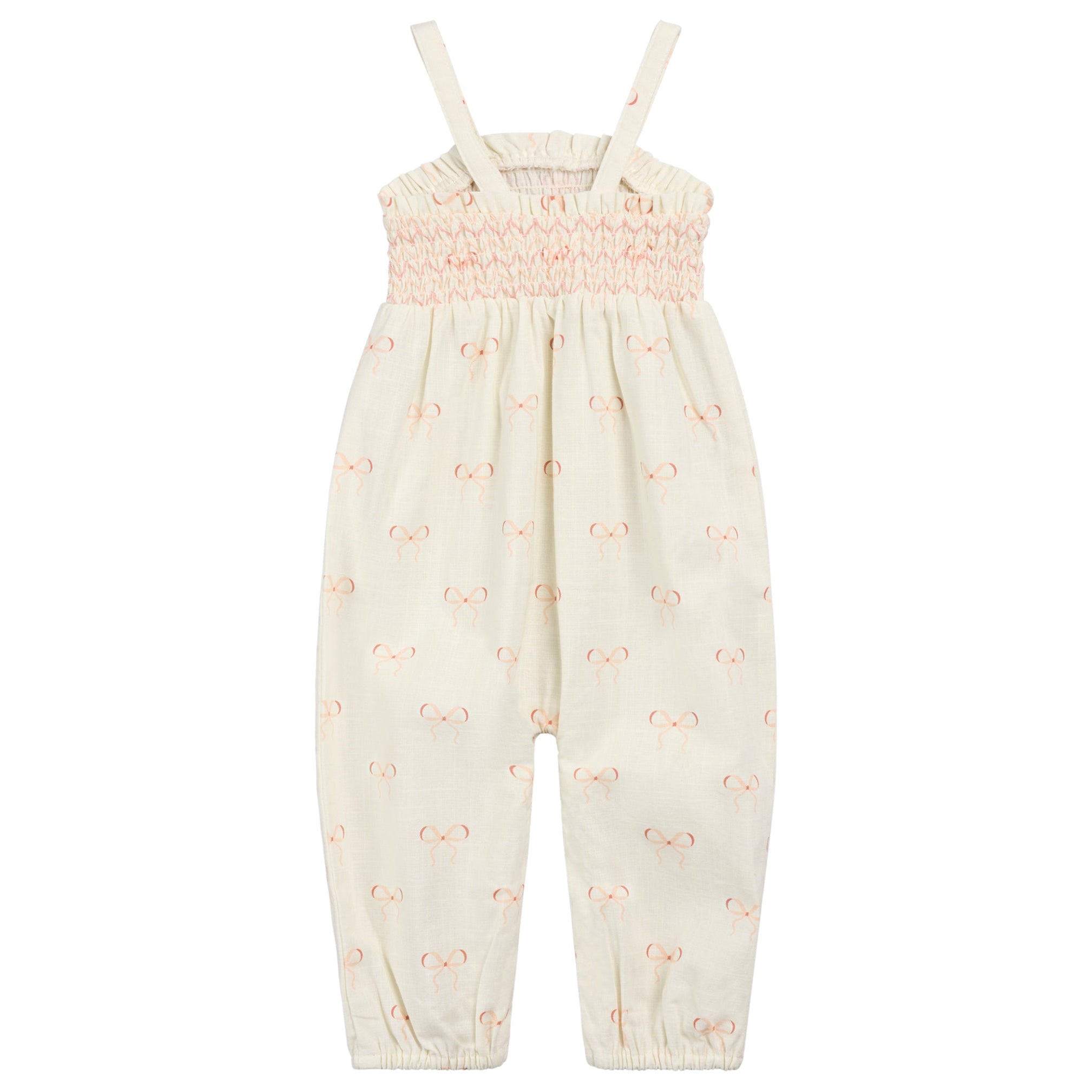 The Bows Playsuit by Miles The Label is a playful and practical warm weather favourite. Featuring a cream base with a delicate pink bow print, it combines charm with comfort in one easy outfit. The smocked tank style top provides a flexible, snug fit, while the loose, breathable pants offer freedom of movement for little adventurers. Thin straps keep her cool on hot days, and ruffle hems add a sweet touch. Designed with snap closures along the legs, diaper changes are quick and hassle free, making this playsuit as convenient as it is adorable.