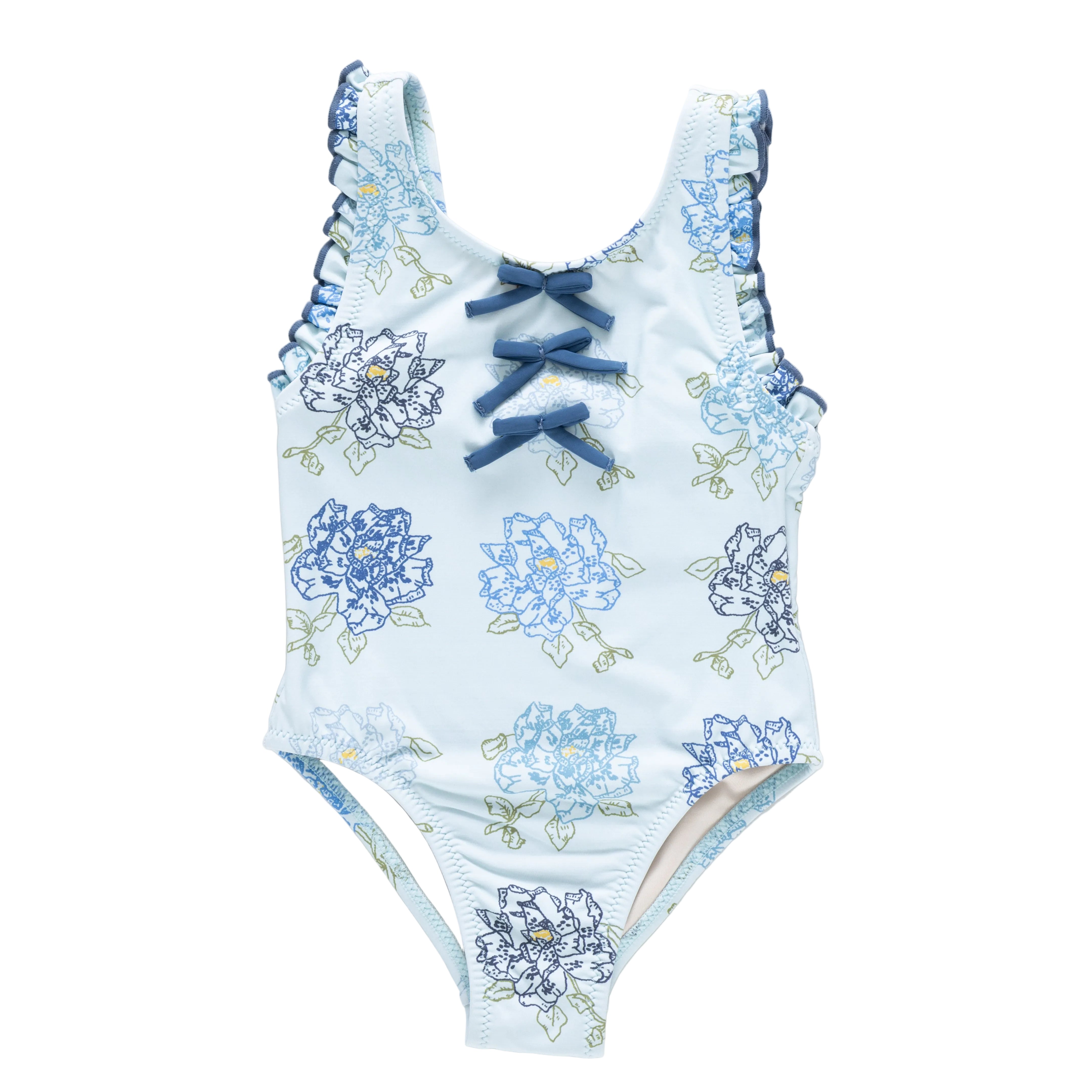 New this season and full of charm, the Blue Quilt Floral Sylvie Bow Suit by Pink Chicken is a standout swim style designed for sweet summer moments. A soft blue quilt inspired floral sets a timeless backdrop, while three applied bows at the center front bodice add signature sweetness and eye catching detail. Playful ruffles at the armholes create a polished silhouette that feels both special and fun, making this one piece perfect for beach days, pool parties, and every splash in between.
