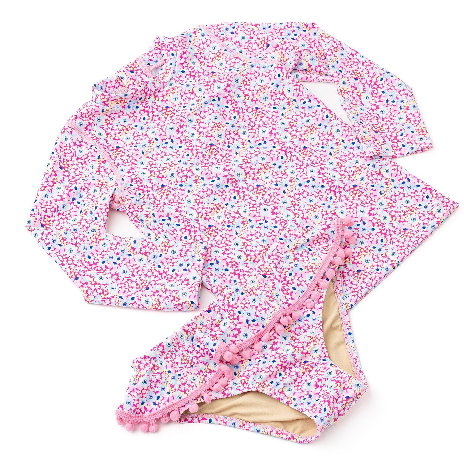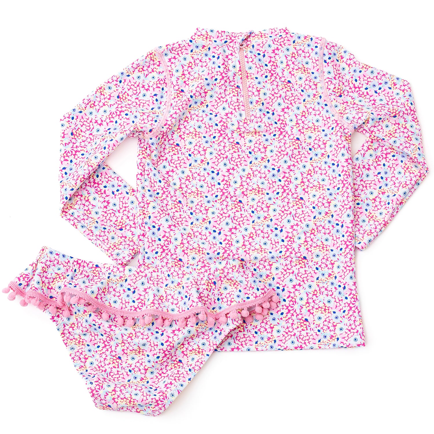 Get ready for sunny adventures with the Electric Ditsy Rashguard Set by Shade Critters in playful pink floral. This long sleeve rashguard set combines full coverage with lightweight, breathable comfort, making it perfect for pool days, beach trips, or backyard splash sessions. The vibrant ditsy floral print adds a cheerful, eye catching touch, while the fully lined fabric and flat zig zag stitching ensure comfort, durability, and a polished finish. With full cut coverage and UPF 50+ sun protection, she can play confidently in the sun all day long. Designed in the USA, this set is a stylish, practical, and sun-smart choice for every little water adventurer.