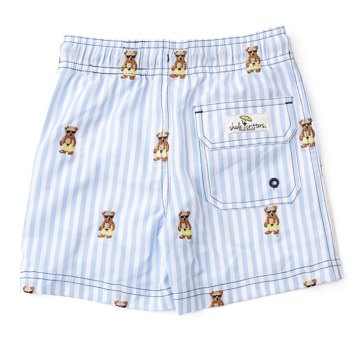 Make a splash in playful summer style with the Teddy Icon Swim Trunks by Shade Critters, featuring a charming teddy bear inspired print that adds a fun twist to his warm weather wardrobe. Made from comfortable 4 way stretch fabric, these swim trunks are designed for all kinds of adventures, from pool days to beach outings and backyard play. The slightly above-the-knee fit allows for easy movement, while thoughtful details like an adjustable drawstring, functional pockets, and a fully lined mesh interior provide all day comfort. Designed in the USA, these trunks also offer UPF 50+ sun protective fabric, making them as practical as they are adorable for summer fun.