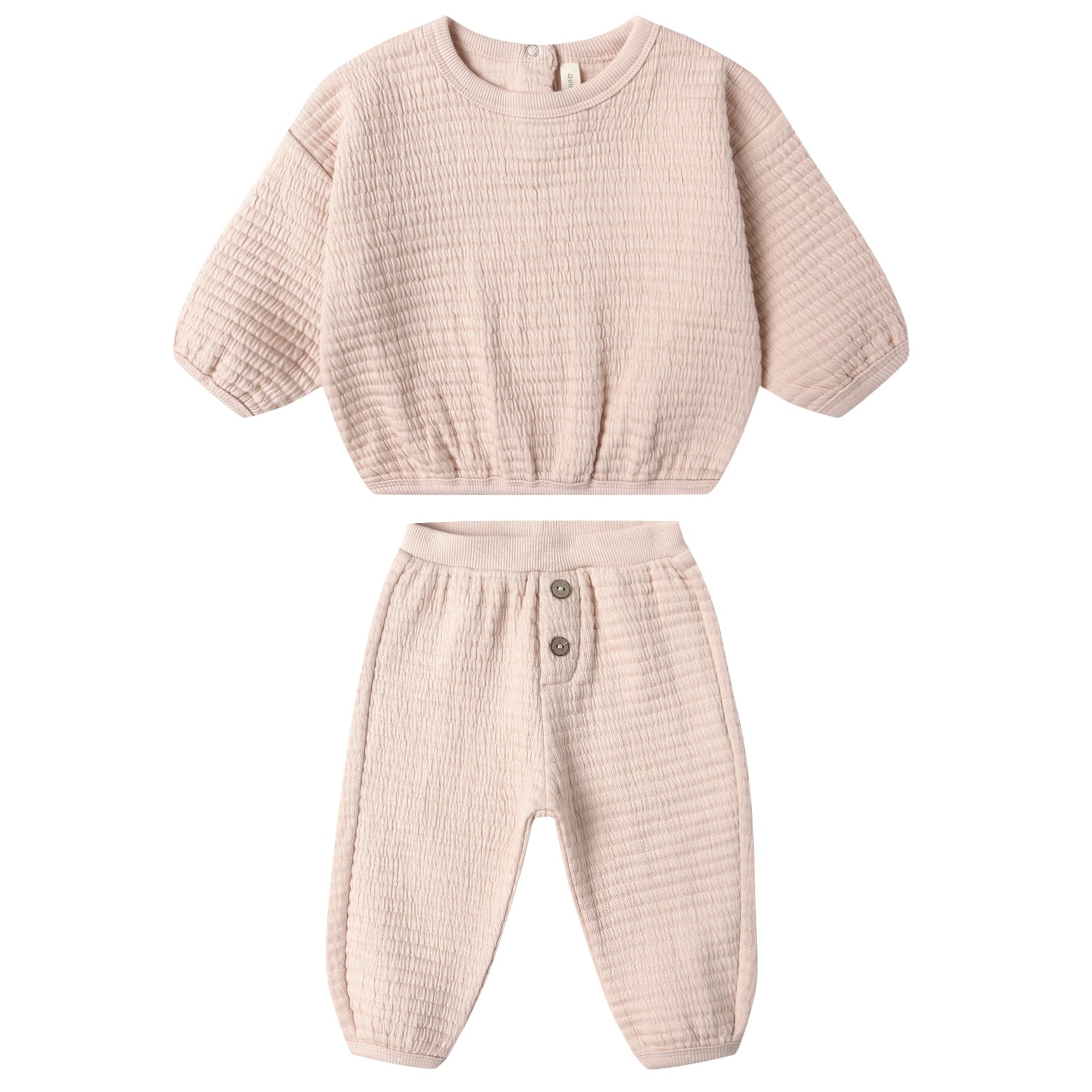 The Antique Textured Sweatset by Quincy Mae is effortlessly cozy and timeless. This two piece set includes a long sleeve sweater top and coordinating pants, both made from soft, textured organic cotton fabric for all day comfort. Designed in a gentle antique pink color, it features relaxed silhouettes, subtle button details on the pants, and elasticized edges for the perfect fit. A beautiful everyday essential for your little one’s wardrobe.
