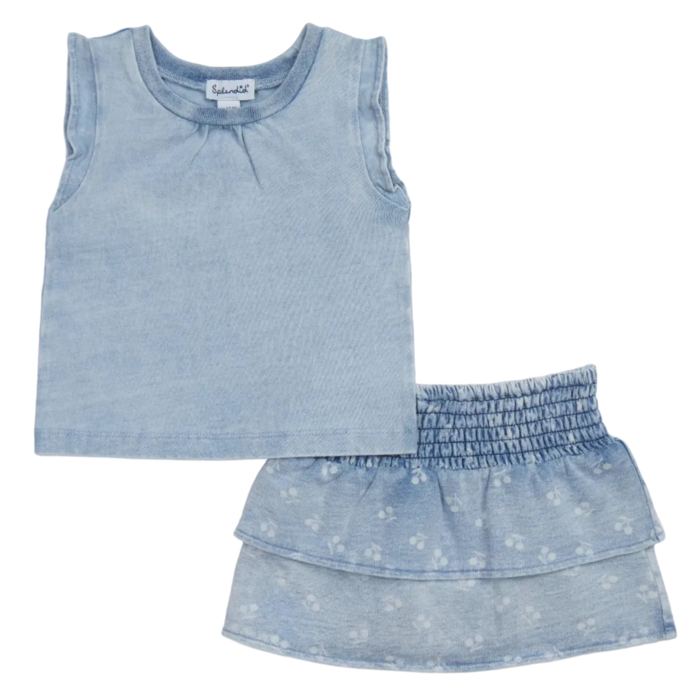 Sweet, twirl ready, and effortlessly cute, the Bleach Wash Cherry Print Skirt Set by Splendid features a light denim blue tiered skirt dotted with white washed cherries and a thick shirred waistband for all day comfort. Paired with a classic, thick tank top in a soft, comfortable fit, this set is perfect for sunny days, playdates, or casual outings. The lightweight chambray fabric and playful cherry print make it easy to mix and match, while the tiered skirt silhouette adds a fun, full look thatās ready for endless compliments.