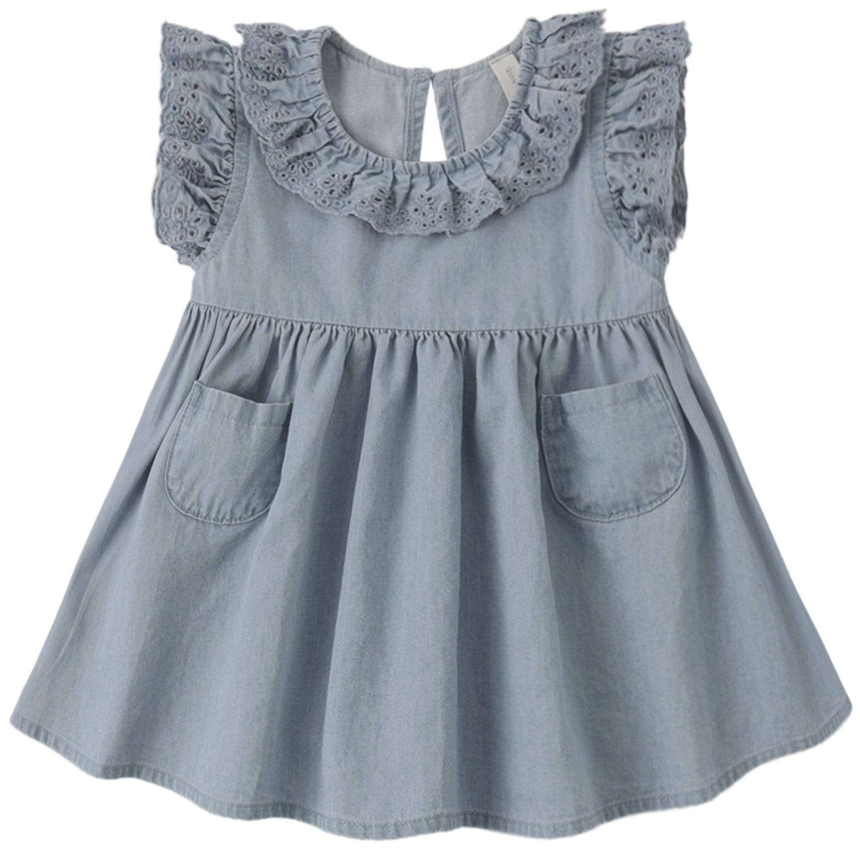 The Chambray Sophie Dress in soft blue by Quincy Mae is a perfect mix of comfort and playful style. Made from super soft, breathable fabric, it features delicate ruffle details around the collar and sleeves, a flowing skirt, and two front pockets for little hands to explore. A convenient button back closure makes dressing easy, while the soft, flowing design keeps your little one comfortable all day, ideal for everyday adventures or special occasions.