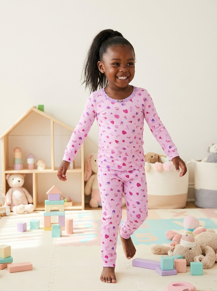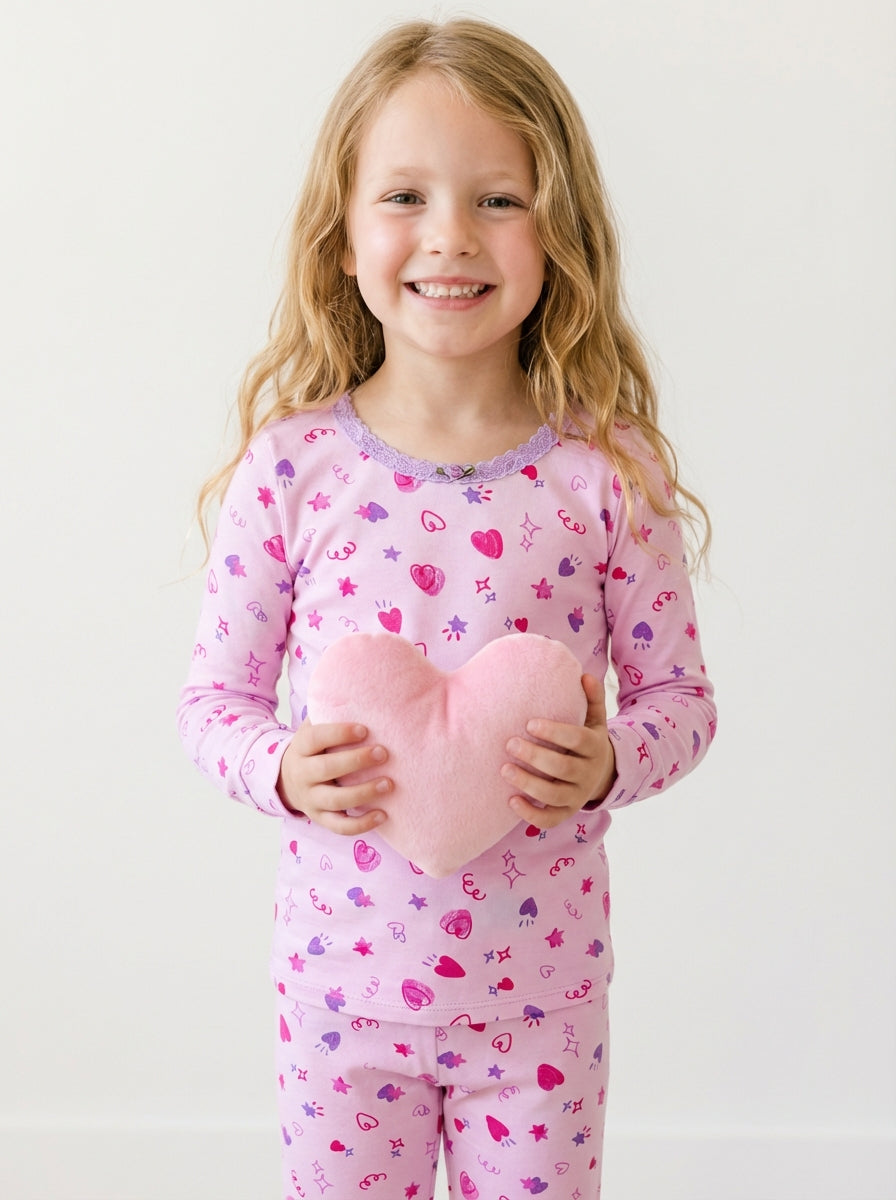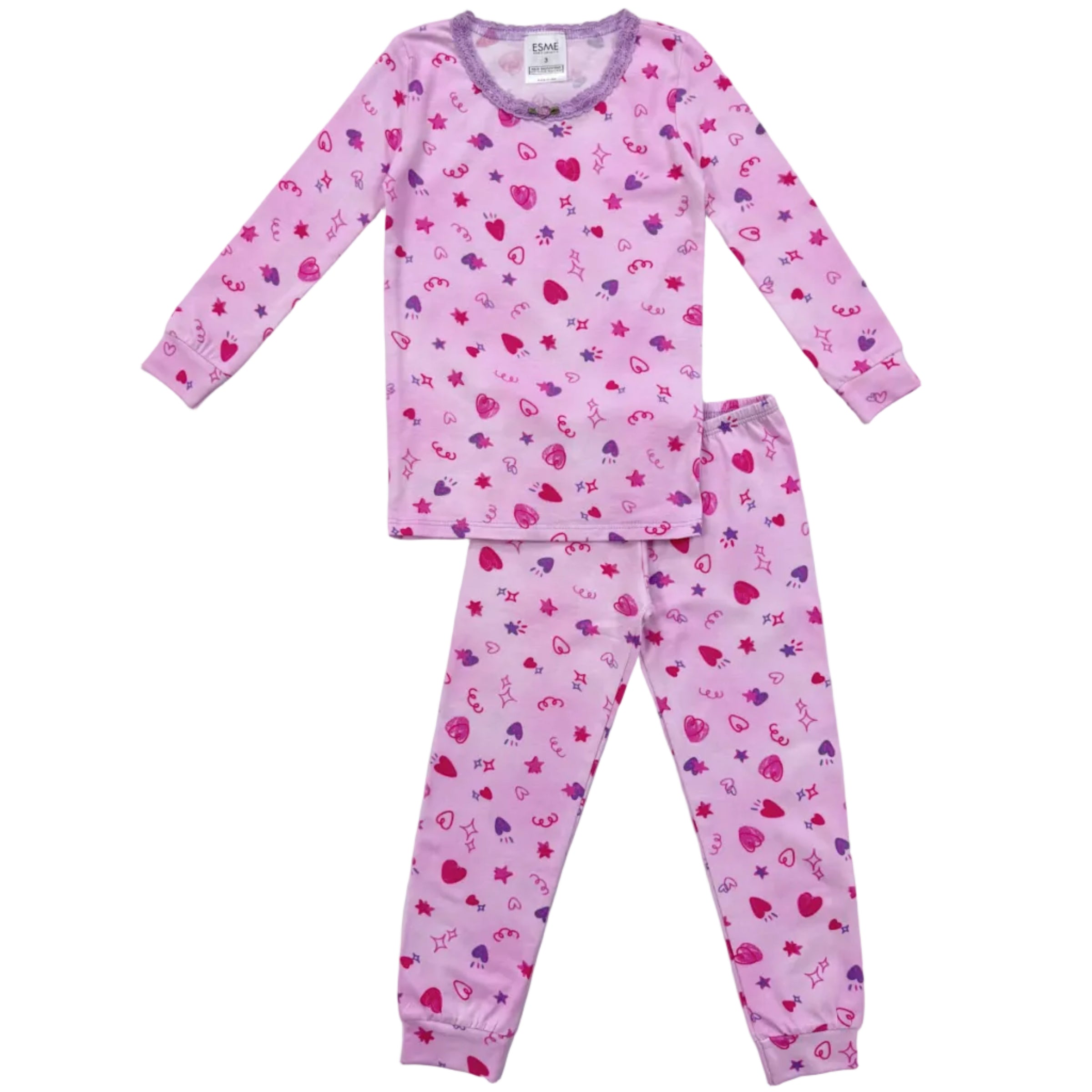 The Doodle LS Pajama Set by Esme, it is designed for ultimate comfort and timeless charm. Made from their signature super soft tri-blend fabric: Cotton, Modal, Spandex, it offers breathability, stretch, and long lasting softness that maintains its shape and color wash after wash. Banded wrists and ankles provide a snug fit, while water based dyes ensure a gentle, chemical free experience. Proudly designed and made in the USA, this pajama set is perfect for dreamy nights and cozy mornings.