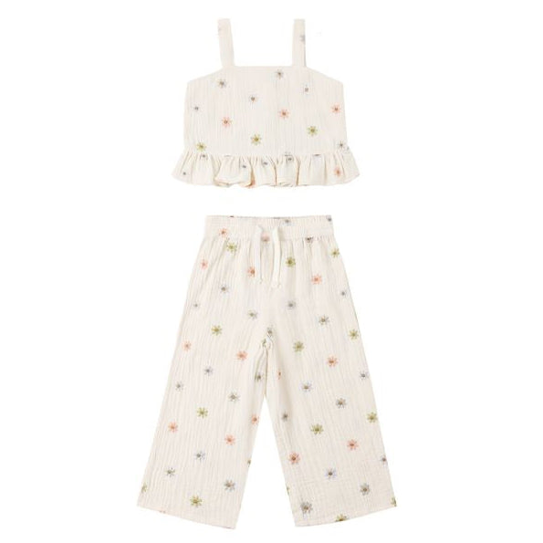Delicate, cozy, and effortlessly charming, the Embroidered Daisy Kayli Set by Rylee + Cru is a perfect blend of style and comfort. Made from super soft 100% cotton, this two piece set features a breezy tank top and matching loose pants with an elastic waistband for easy, all day wear. The cream base is sprinkled with small, colorful embroidered daisies, bringing a floral touch to this adorable set. Perfect for playdates, lounging, or everyday adventures, the Kayli Set combines sweet details with practical comfort for little ones.