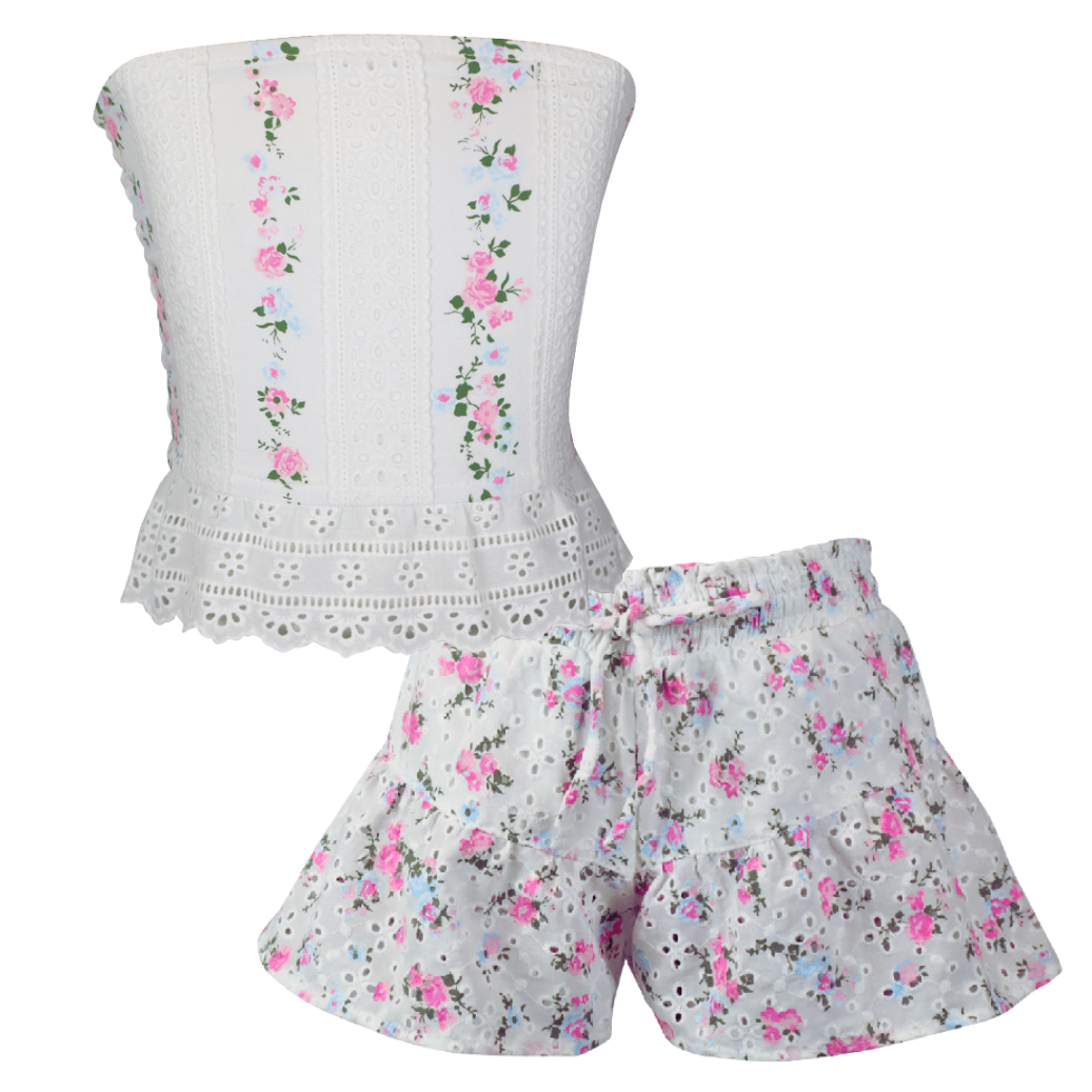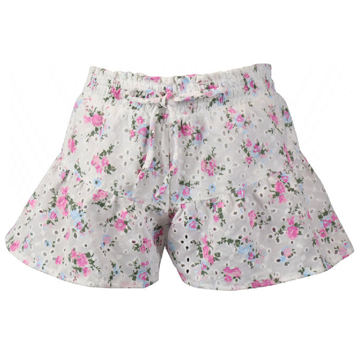 The Floral Eyelet Shorts by Flowers By Zoe are a sweet and breezy must have for warm weather days. Designed in soft white eyelet fabric with an allover pink and pastel floral print, these shorts feature a comfortable elastic waistband with an adjustable drawstring for the perfect fit. The relaxed, flowy silhouette offers easy movement, while delicate cutout details add a feminine, airy touch.
