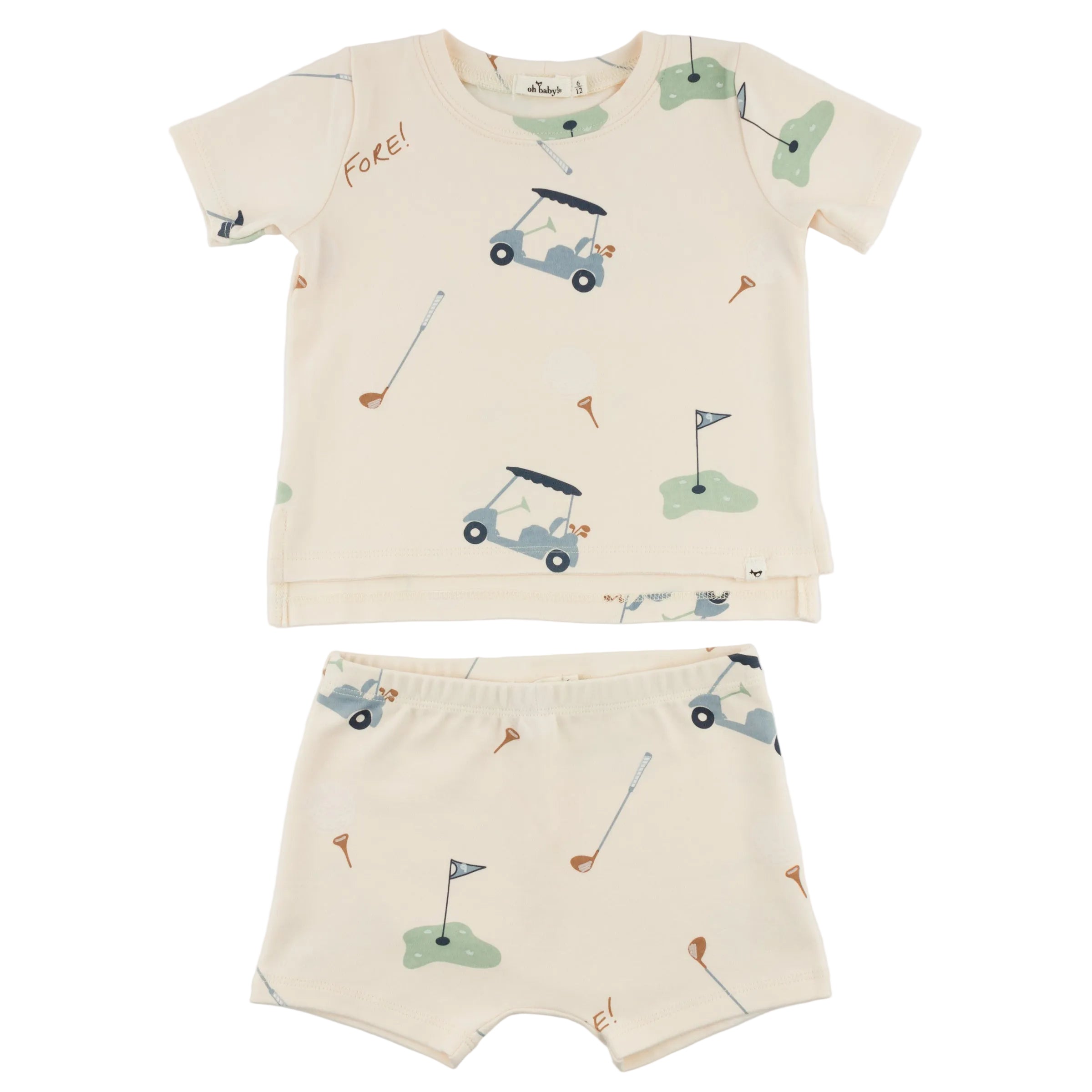 The Golf Print SS Short Set by Oh Baby! is a sporty and comfortable outfit perfect for little golfers. Featuring a refreshing cream base color with playful golf themed motifs throughout, this set includes a matching t-shirt and shorts. Made from ultra soft, breathable cotton, the elastic waistband on the shorts ensures a secure and flexible fit for all day play. Fun, practical, and full of charm, the Golf Print Short Set keeps your little one cool, comfortable, and stylish during every adventure.