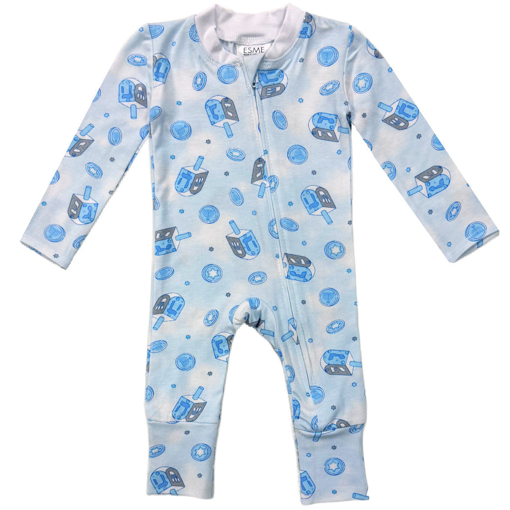 The Happy Hanukkah Blue Flip Footie by Esme brings cozy comfort and festive cheer to your little one’s bedtime. Made from Esme’s signature ultra soft tri-blend of cotton, modal, and spandex, this footie offers the perfect mix of stretch, breathability, and long-lasting softness, keeping your child snug all night long. Designed with built-in mittens and foot covers for extra warmth and protection, this snug fit style is dyed with gentle, water based dyes and never treated with flame retardants, ensuring it’s as safe as it is soft. The charming Hanukkah themed print in cool blue tones adds a joyful touch to bedtime, making every night feel like a celebration. Proudly designed and made in the USA, the Happy Hanukkah Blue Flip Footie is a festive favorite that blends comfort, quality, and holiday spirit in one adorable piece.