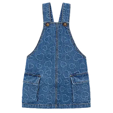 The Heart Denim Overall Dress by Mayoral is a playful and charming piece for little ones. Made from soft, durable denim in a classic wash, it features an allover subtle heart pattern with white heart outlines, adding a sweet touch. Designed with classic overall straps and two functional front pockets, it’s perfect for layering over t-shirts for everyday adventures, playdates, or casual outings, combining comfort and timeless style in one adorable outfit.