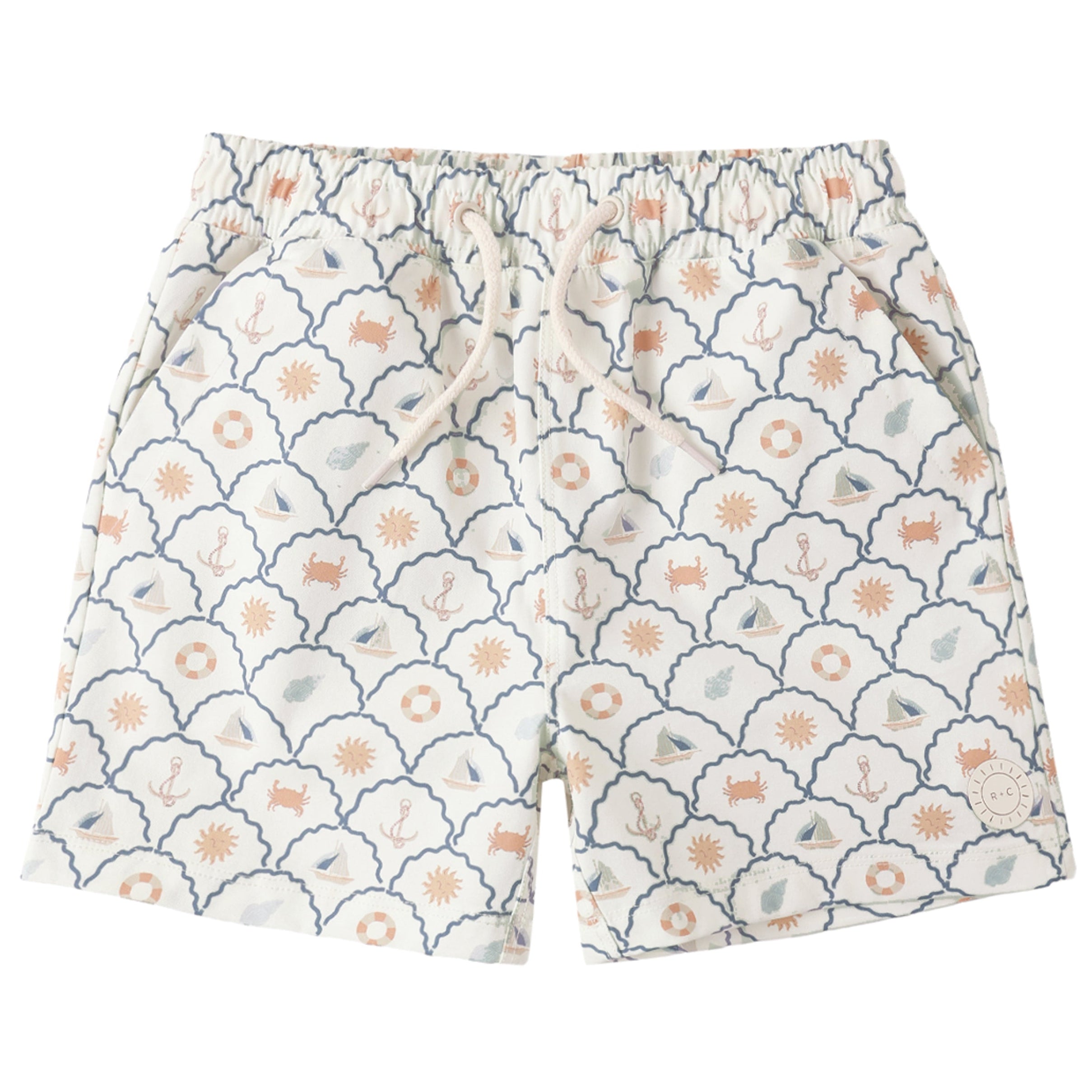 Make a splash in style with the Boys Nautical Swim Shorts by Rylee + Cru, where imagination meets seaside charm. These swim trunks feature a playful seashell pattern from top to bottom, each shell outlined in soft pastel blue and filled with nautical shapes in a mix of gentle pastel colors. Set against a warm cream background, the look feels both fresh and timeless, perfect for sunny days by the water. Made from comfortable, quick drying fabric with a secure elastic waistband, these swim shorts are designed for all day play, from beach escapes to poolside fun. Lightweight, durable, and full of personality, theyāre the perfect blend of function and coastal flair, ready for every summer adventure.