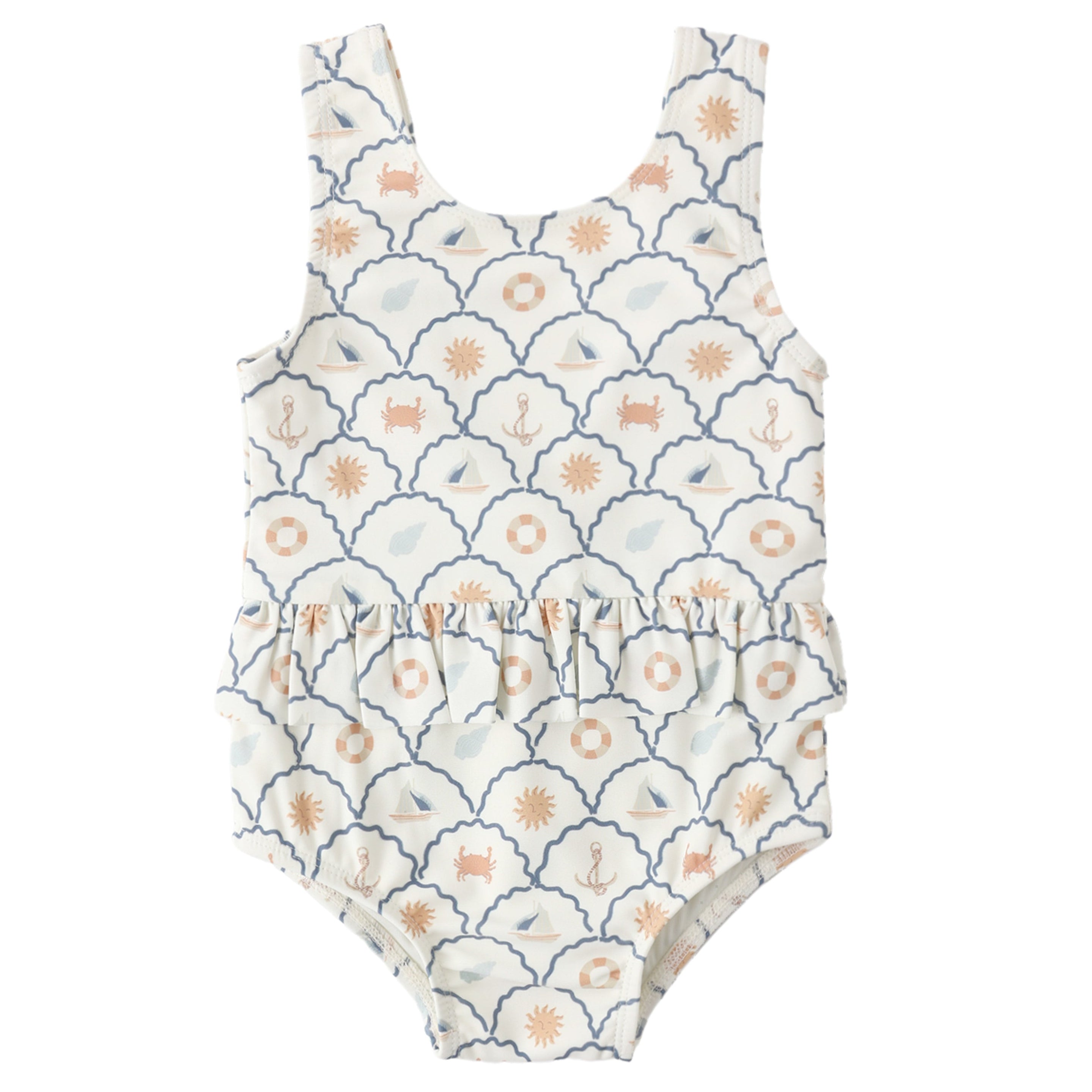 Introducing the Nautical Skirted 1pc Swimsuit by Rylee + Cru, a sweet, sea inspired suit made for sunny days and splashing fun. This classic one piece features a skirt detail at the waist for a playful, fun touch, paired with a seashell print that brings coastal magic to every adventure. Each shell is outlined in soft pastel blue and filled with nautical shapes in a mix of pastel colors, all set against a warm cream background for a fresh, summery look. Designed with comfort and movement in mind, this swimsuit is perfect for pool play, beach days, and everything in between, the cutest way to dive into the season.