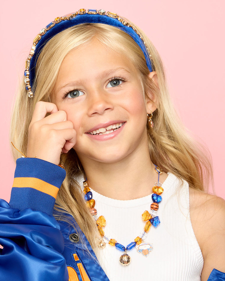 Bring the bling to the court with the New York Knicks Jeweled Headband by Super Smalls! Designed for fans of all ages, this plush blue velvet headband combines comfort and style with a bold touch of team spirit. Sparkling gem details add a hint of game day glam, while emblem charms featuring the iconic New York Knicks logo make it a standout accessory for any fan. Whether you’re cheering courtside at Madison Square Garden or adding a sporty sparkle to your everyday look, this headband is the perfect way to show your Knicks pride in style. Made with soft velvet for a comfy fit and dazzling embellishments for extra shine, it’s a slam dunk accessory for any occasion.