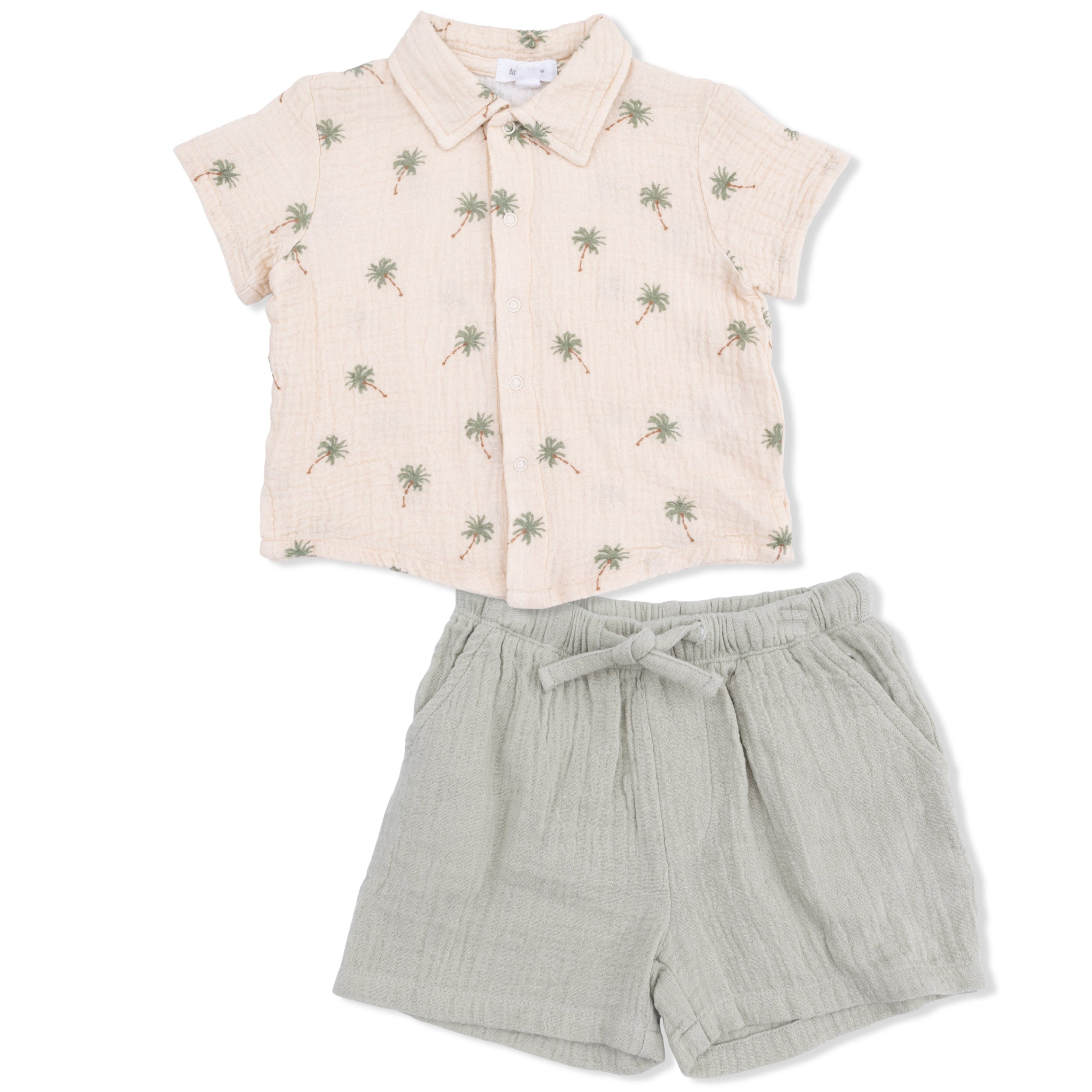 Bring on the sunshine with the Palm Trees Polo Button Down Set by Angel Dear, a breezy warm weather essential for your little explorer. This two piece set features light green muslin shorts paired with a beige top adorned in a playful green palm tree print, giving off effortless vacation vibes. The top is made from soft, breathable fabric for all day comfort, while the shorts offer a relaxed fit and lightweight feel that’s perfect for active play or laid back lounging. Whether it’s a beach day, a backyard adventure, or just a sunny stroll, this set keeps your little one looking cool and feeling comfy.