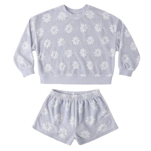 The Periwinkle Daisy Karli Set by Rylee + Cru is a lightweight two piece perfect for sunny days and playtime adventures. Made from soft terry cloth, it features a cozy sweater top with a relaxed fit and matching shorts with an elastic waist for easy comfort. The cheerful periwinkle color also features a daisy print, making it an ideal choice for summer mornings, park outings, or casual days at home.