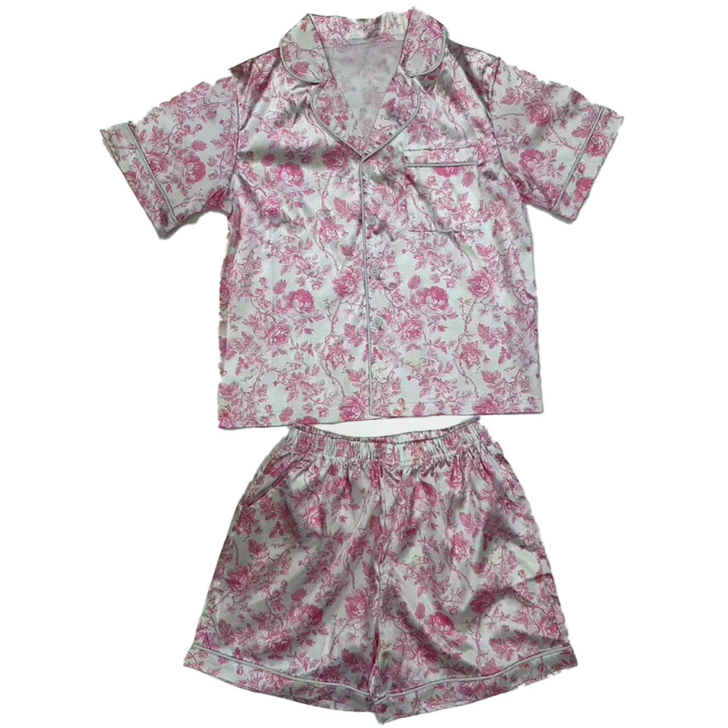 Relax in effortless comfort with the Pink Floral Loungewear Set by Tweenstyle. This dreamy two piece set features a collared, short sleeve button down top paired with matching elastic waist shorts, both made from a super silky soft fabric that feels smooth and lightweight against the skin. Designed with a white background and a pink floral pattern throughout, it brings a fresh touch to her downtime style. Perfect for lounging, sleepovers, or cozy nights in, this set combines elegance and comfort for a look that’s as pretty as it is relaxing.