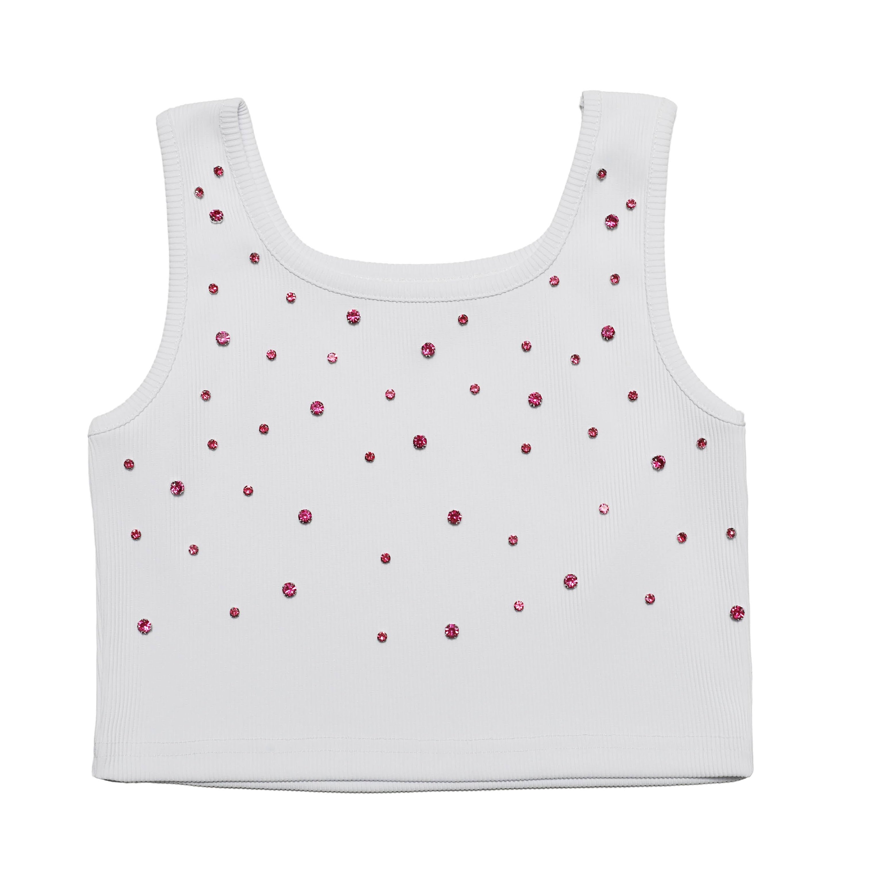 The Pink Studded Crop Tank by MIA is a stylish staple for hot weather days, featuring a classic white ribbed tank design accented with pink studs throughout for added shine and flair. Lightweight and comfortable, this cropped tank is perfect for any outfit, easy layering, and adding a fun, fashionable touch to everyday outfits.