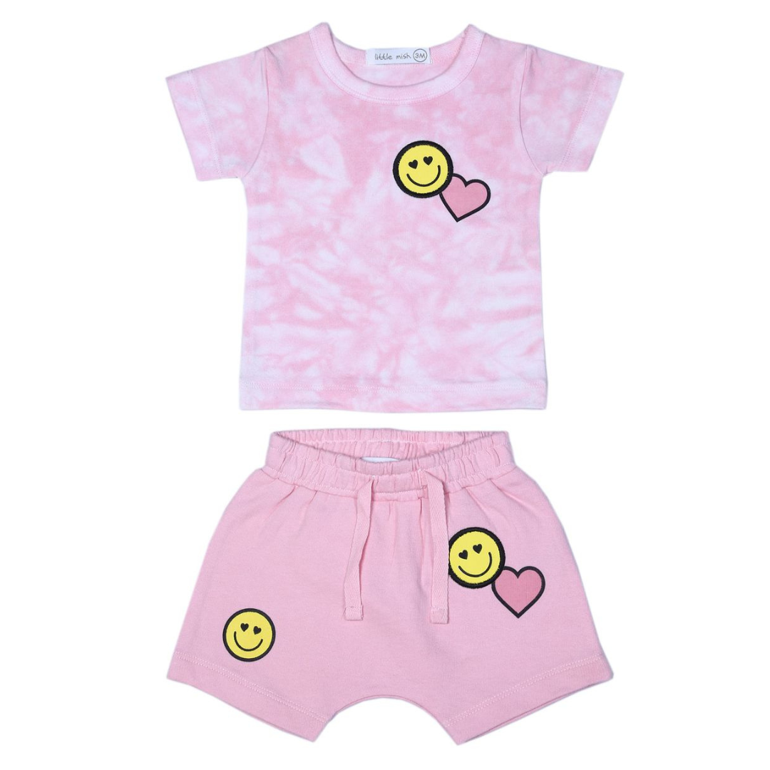 Bring smiles to every day with the Little Mish Smile Tee & Shorts Set in pink! This playful two piece set features a soft cotton t-shirt and comfy elastic waistband shorts, both decorated with cheerful smiley faces and heart motifs. Lightweight and breathable, it keeps little ones comfortable whether they’re playing, lounging, or out and about. Perfect for mixing, matching, and adding a touch of joy to any outfit, this set is as fun as it is cozy.