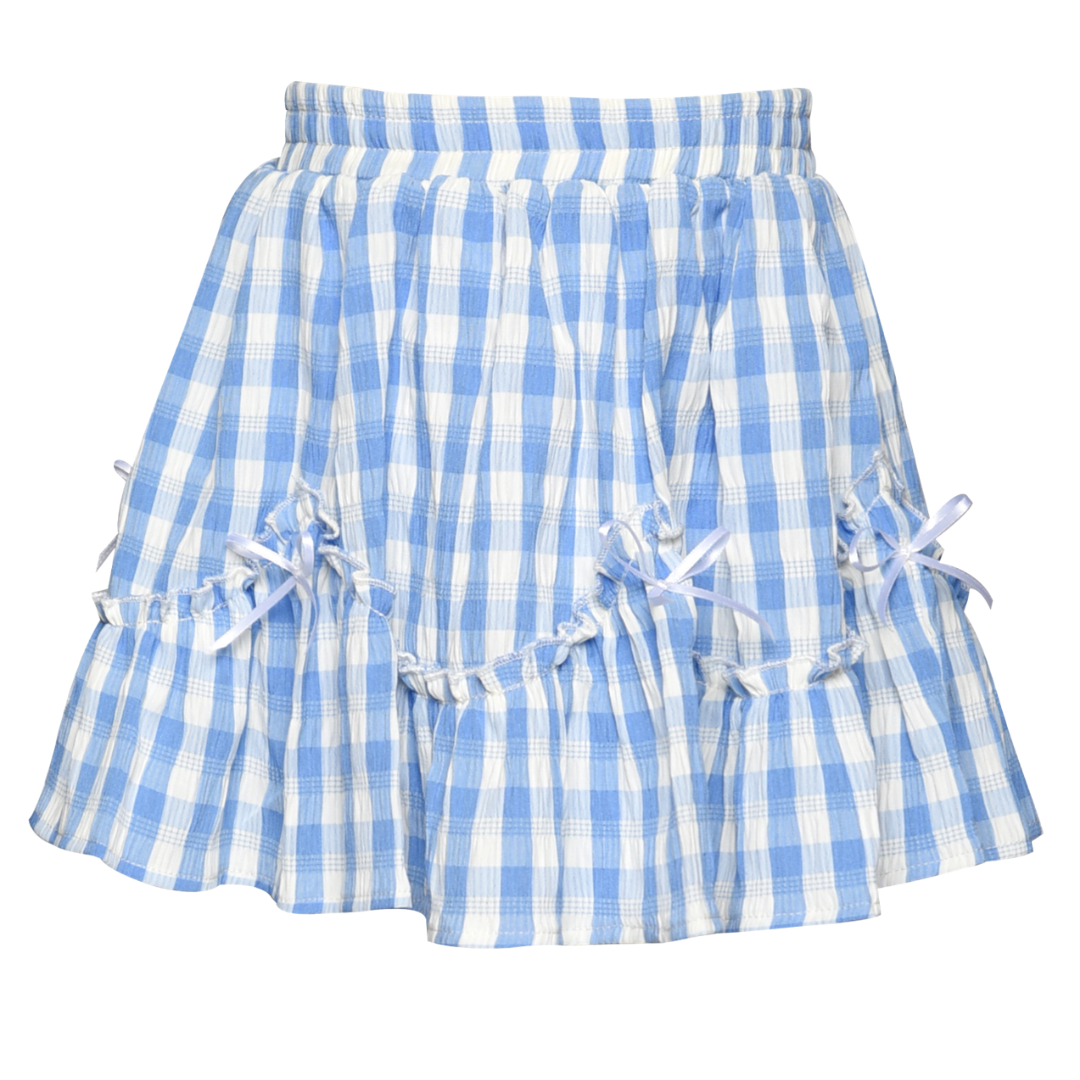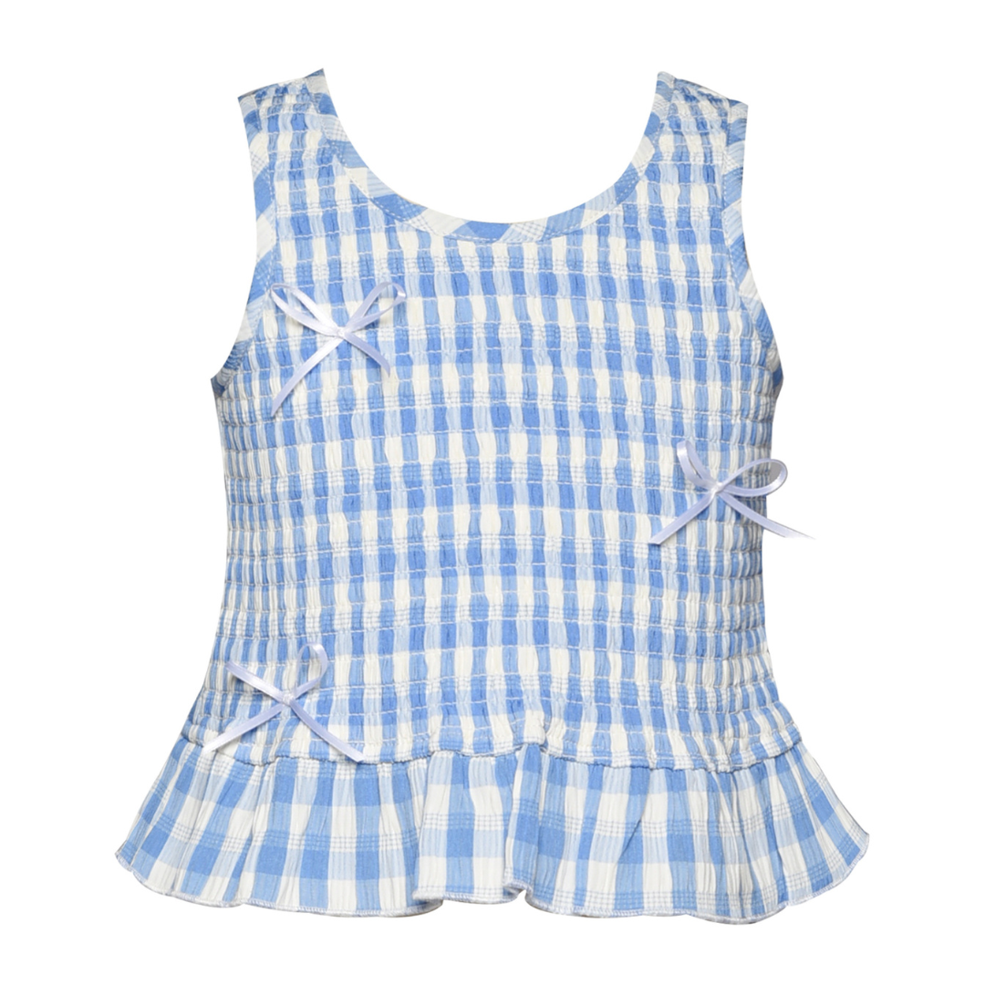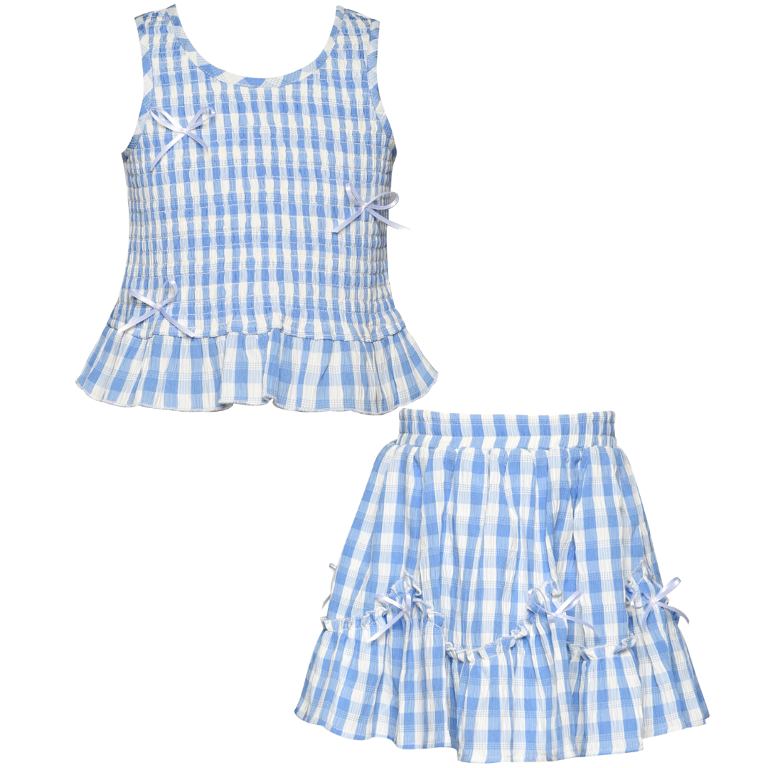 Sweet and timeless, the Smocked Gingham Bow Skort Set by Baby Sara is a charming look in classic blue and white checkered gingham. The matching tank top features thick straps, a smocked bodice for a comfortable, flexible fit, and a ruffle hem for a playful finish, with delicate thin white bows scattered throughout for an extra touch of sweetness. The coordinating skort mirrors the same gingham pattern, designed with a soft, easy fit and finished with tiered ruffles and dainty bow accents along the sides for added charm and movement. Perfect for sunny days, outings, and special moments, this set combines classic style with a fun, girly twist.