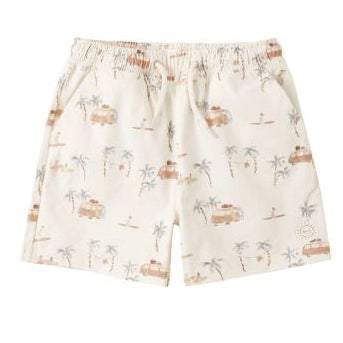 Make a splash with the Surf Town Boardshort by Rylee + Cru, designed for endless sunny adventures! These super soft shorts feature UPF 50+ protection to block harmful UV rays, keeping your little one safe and comfortable all day. Set on a cream base, they are adorned with a playful surf and palm tree motif in soft pastel colors, adding a whimsical, beachy vibe. The elastic waistband with an adjustable drawstring ensures the perfect fit, while two side pockets and a breathable mesh lining provide practical comfort for all their poolside or seaside fun. Perfect for sandcastles, splash pads, and sunny backyard adventures!